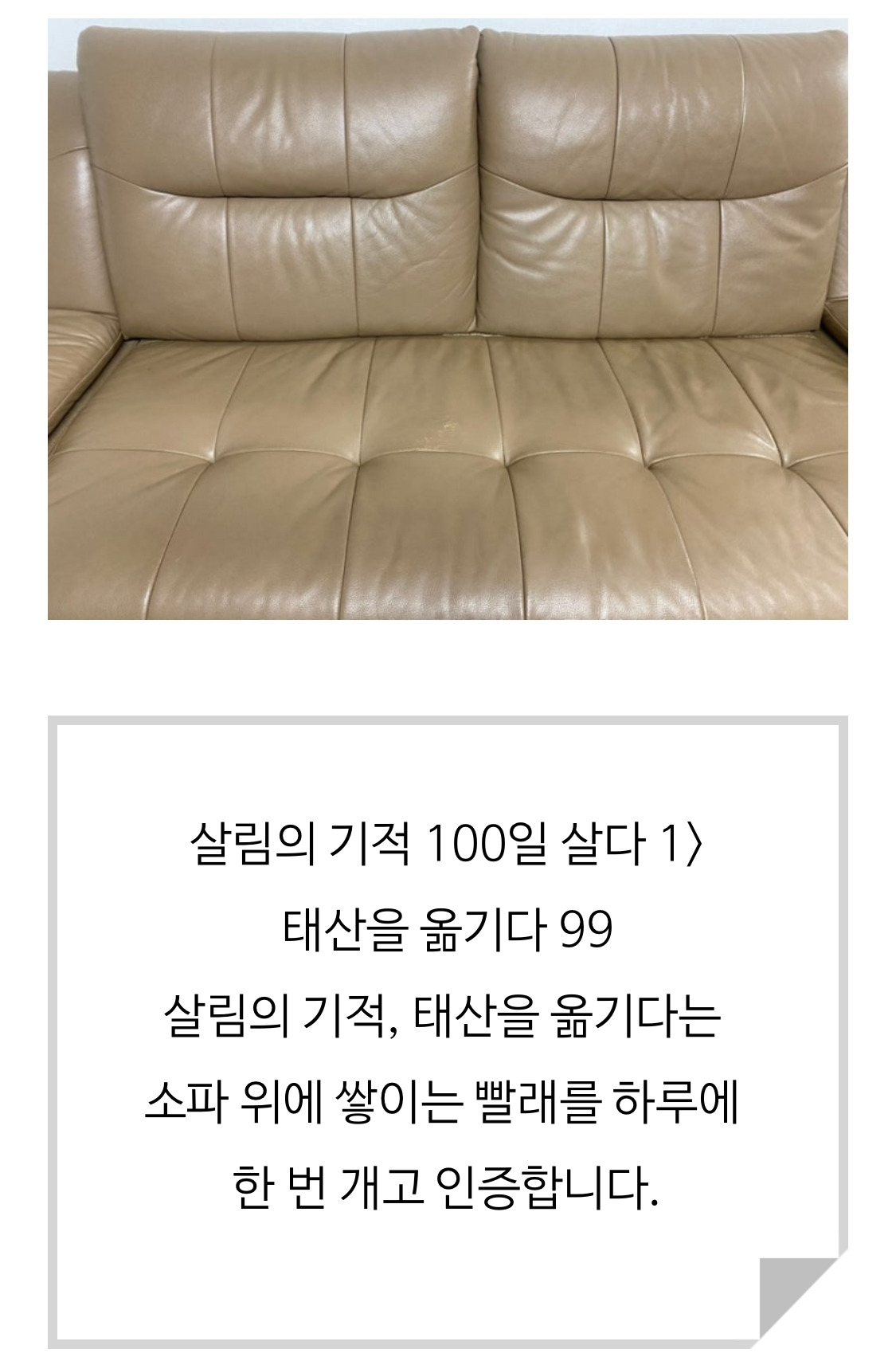 빨래를 개고 사진을 찍는 자연스러운 현상. 이상한 규칙을 만들어 99일 동안 가족들을 들볶았다. 또 사진 찍는 것을 깜빡 잊었다. 보통 빨래가 나오려면 한참의 텀이 생기는데 잊고 있는 동안 한 무더기의 빨래가 또 소파 위에 쌓였다.