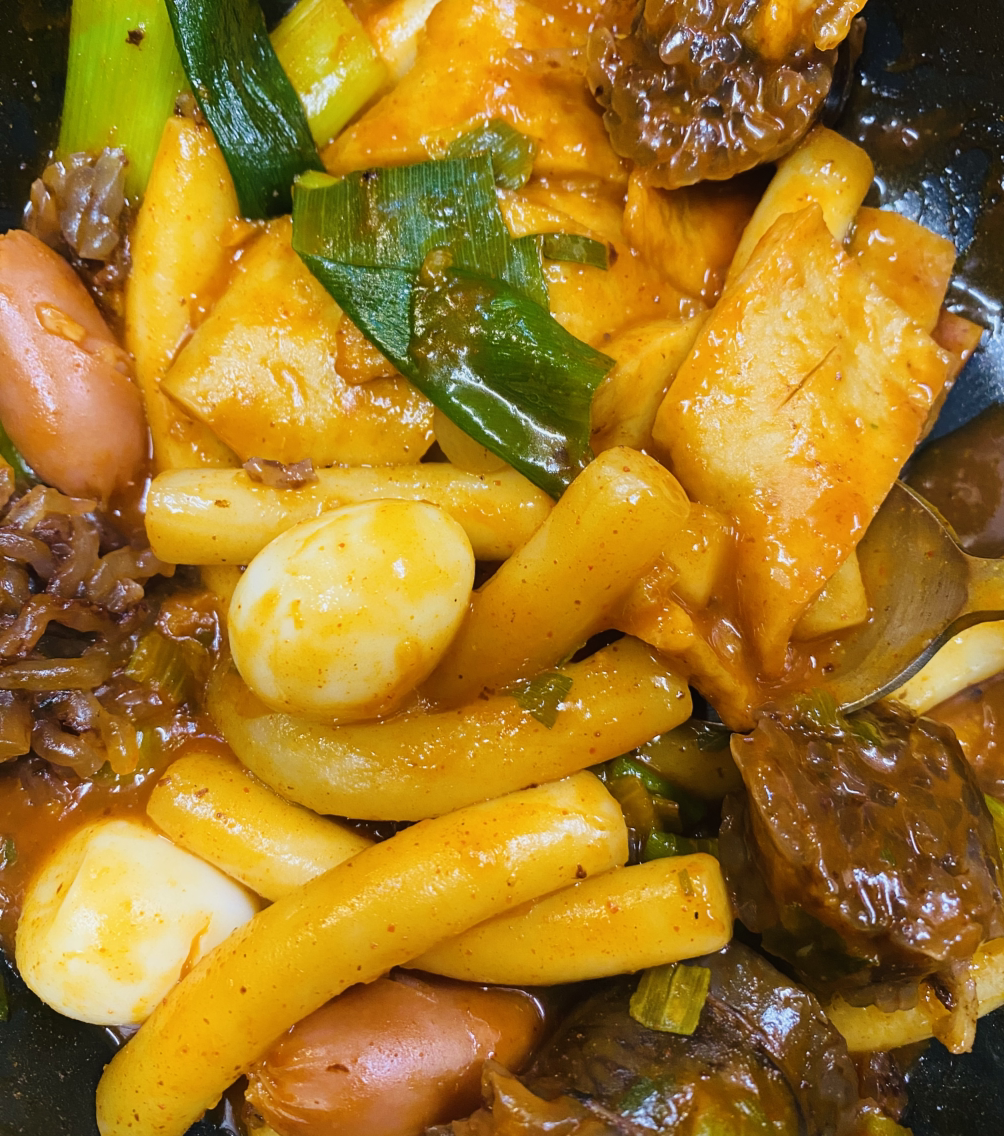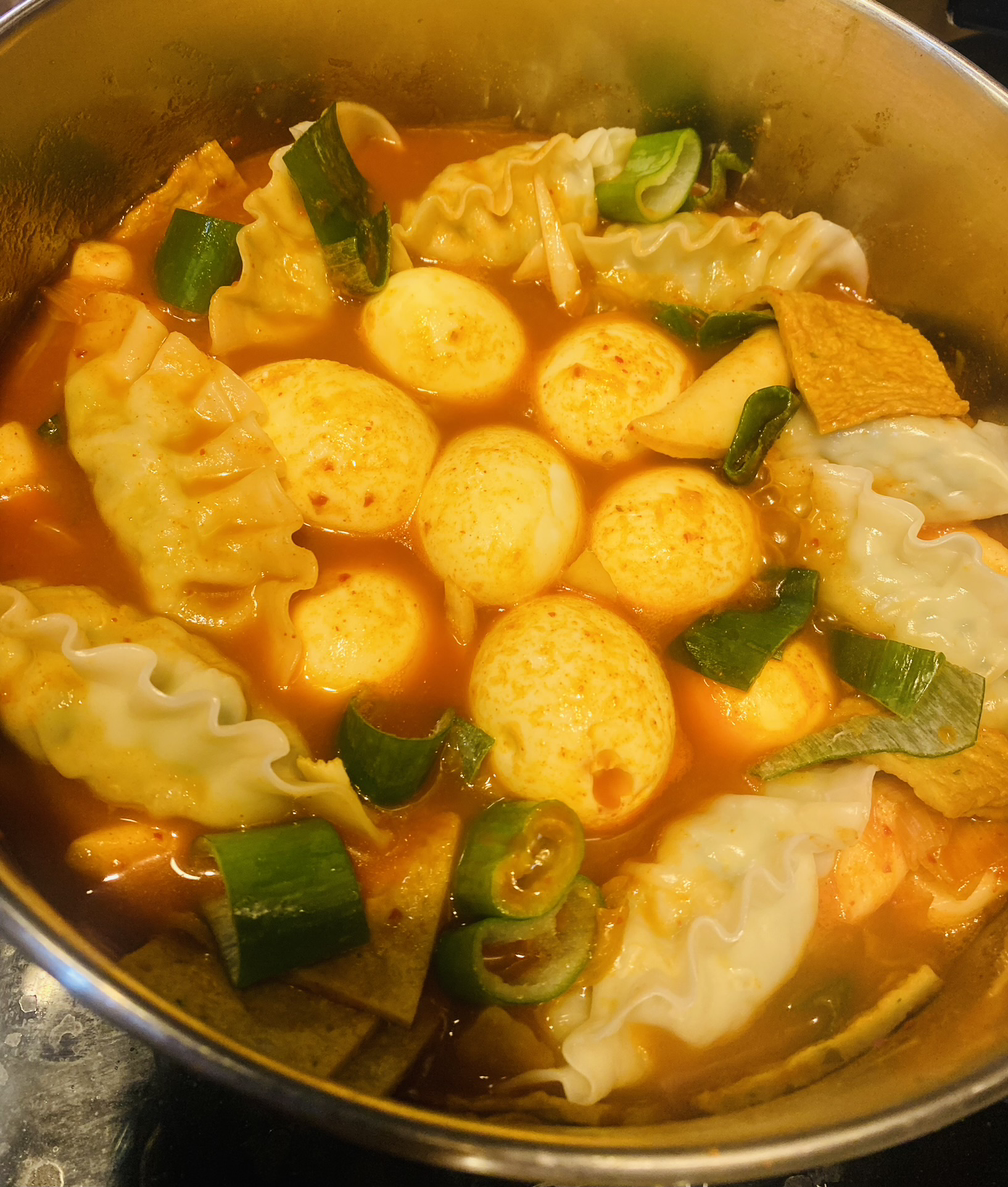 파, 마늘, 양파, 양배추를 넣고, 야채 육수 끓이듯 푹 끓이다 설탕, 소스와 고춧가루 투하! 국물이 진득하게 끓으면 떡, 어묵, 계란, 만두를 넣고 가끔씩 저어줍니다.