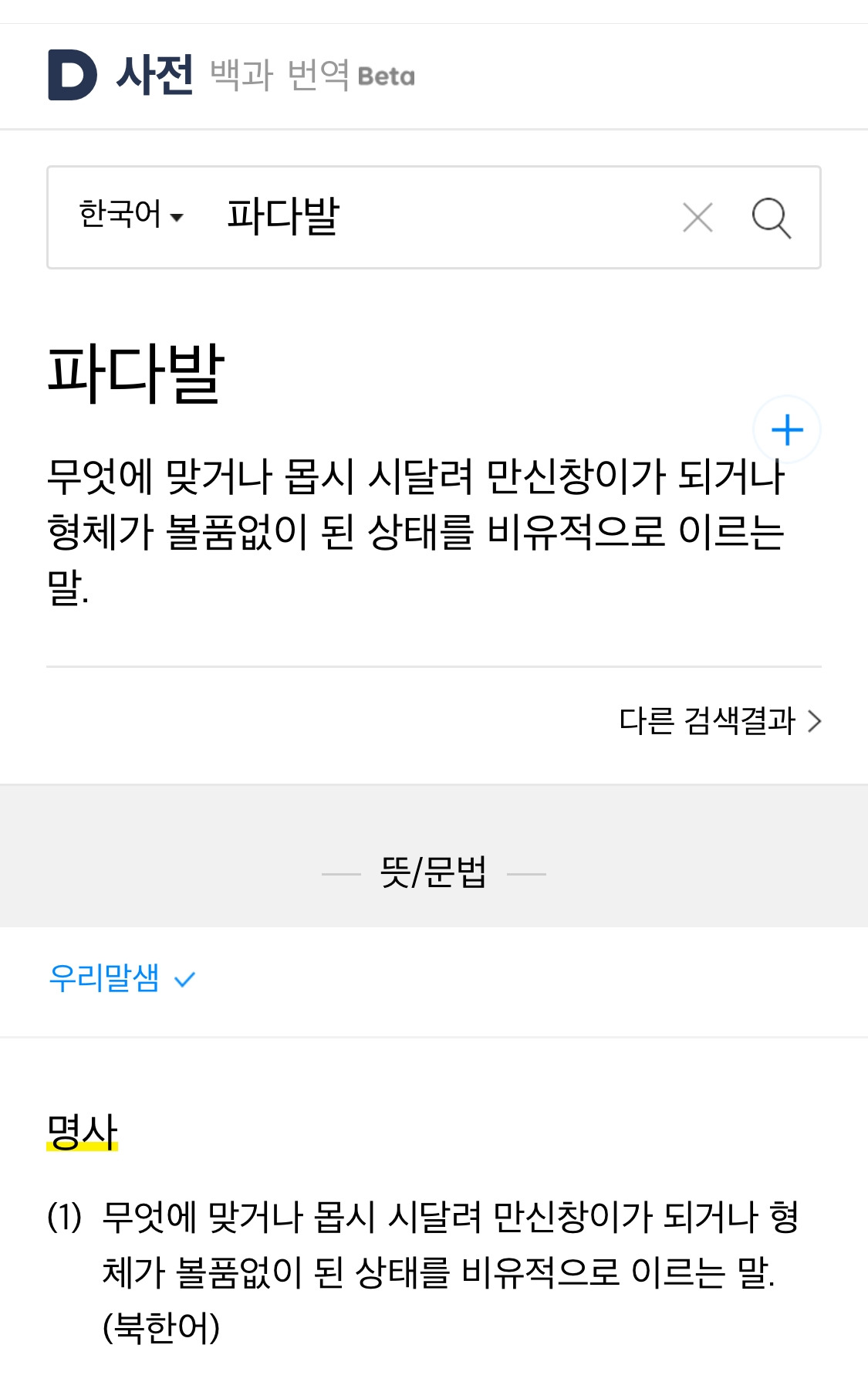 글을 올린 후 ‘파다발’을 검색하였더니 ‘파다발’이 만신창이, 볼품없는 것을 비유하는 북한어라고 나왔다. 그러나 나는 절대 나쁜 의미로 쓴 것은 아니며, 나에게는 ‘파다발’은 꽃다발과 같다는 의미이다.