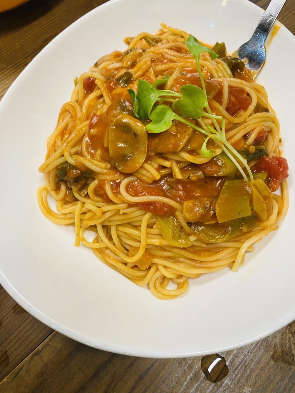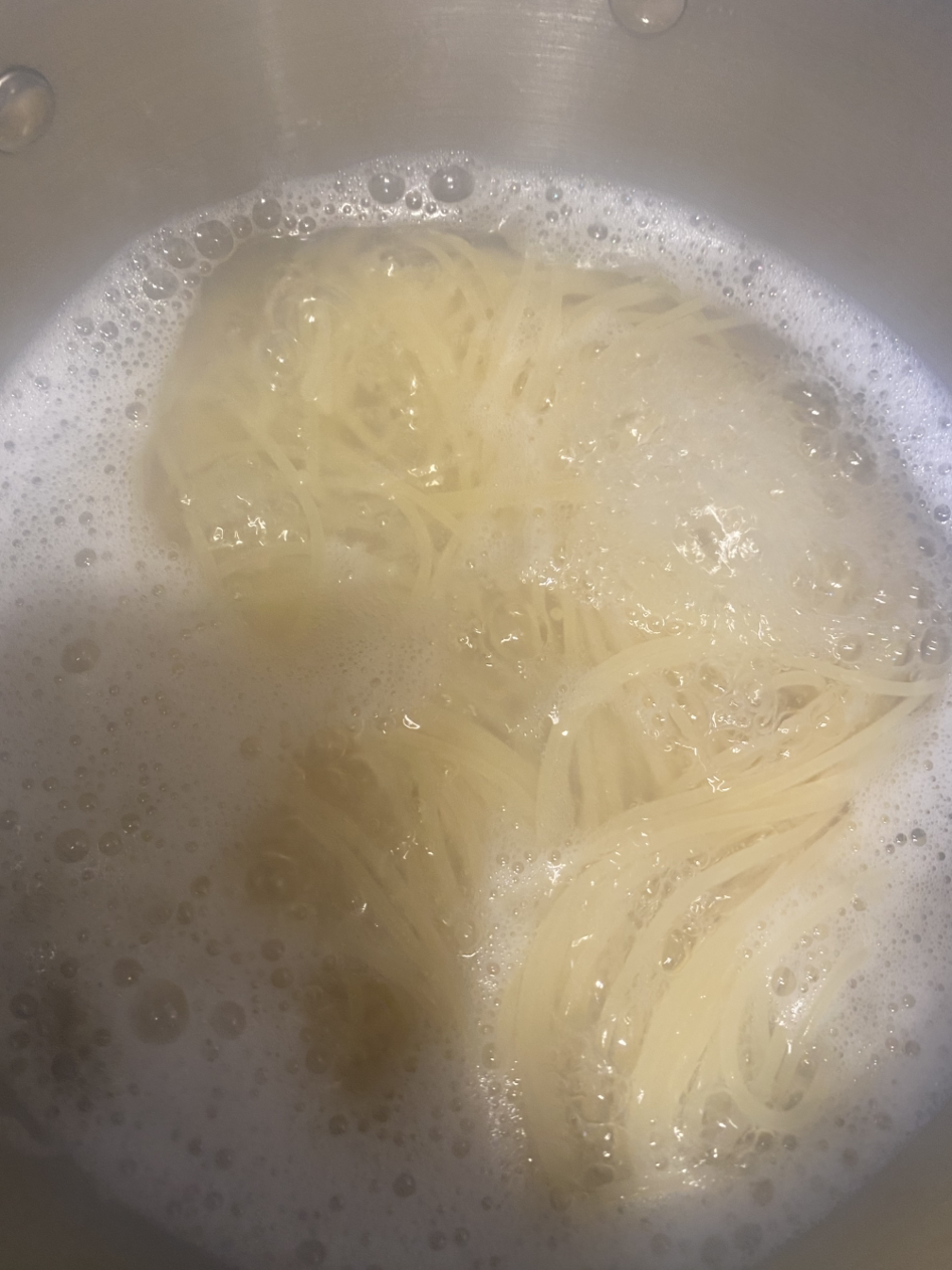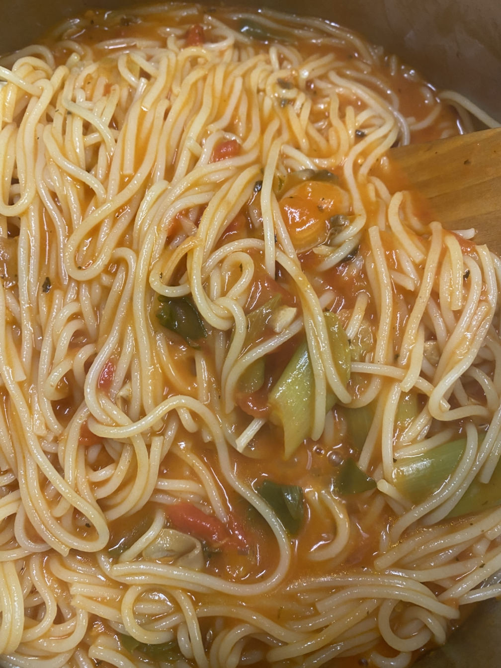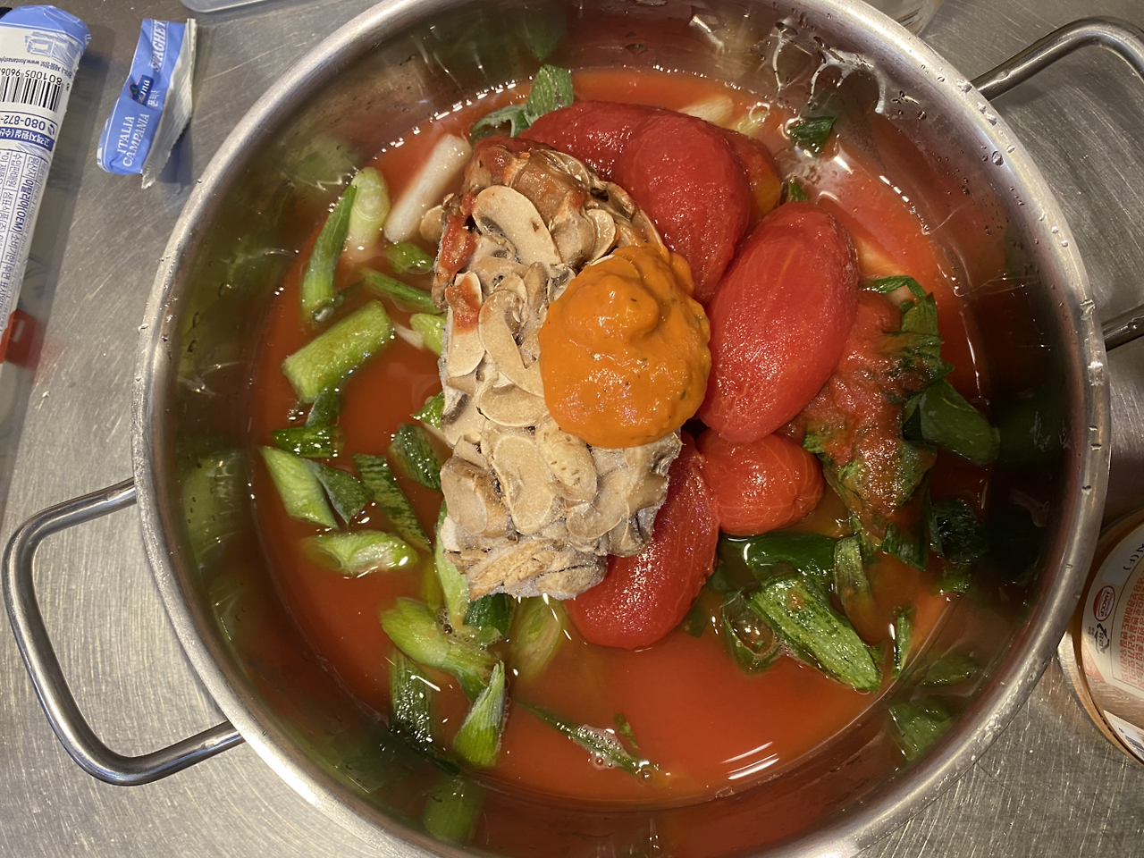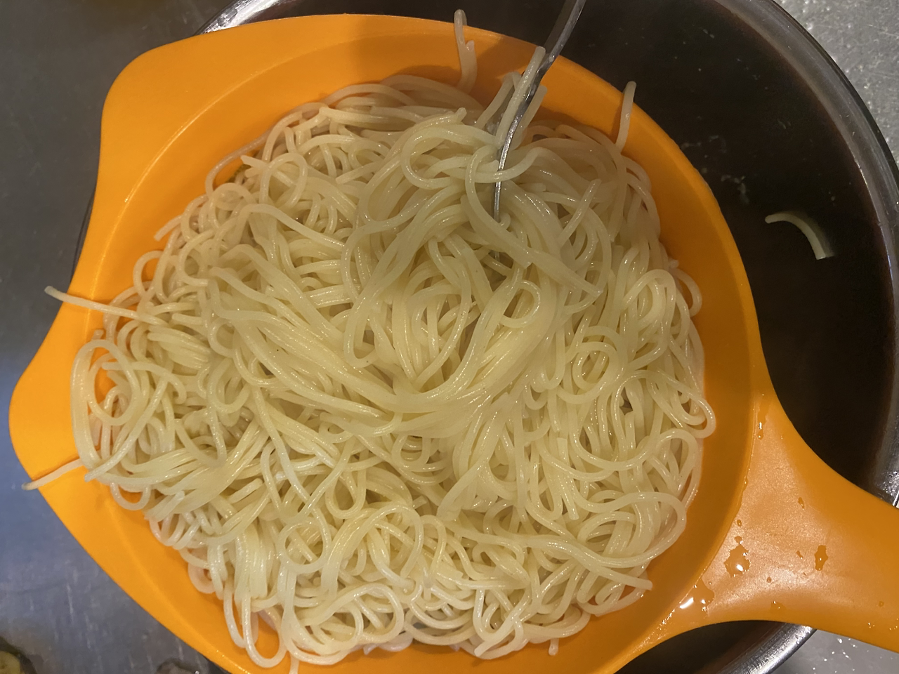 납작한 팬에 토마토홀 400g 캔을 하나 넣고 물을 400g 넣는다. 파와 양송이버섯을 넣고 시판 로제 소스 200g 넣는다. 물을 200g 더 넣는다. 푹 끓인다. 된장국 같다. 물이 보글보글 끓는다. 면도 보글보글 끓는다. 면을 분명 10분 타이머 해 놓았는데 타이머가 안 눌렸나? 대충 면을 건진다. 양이 많아 채반 하나를 가득 채운다. 다행히 넘치지는 않았다.
