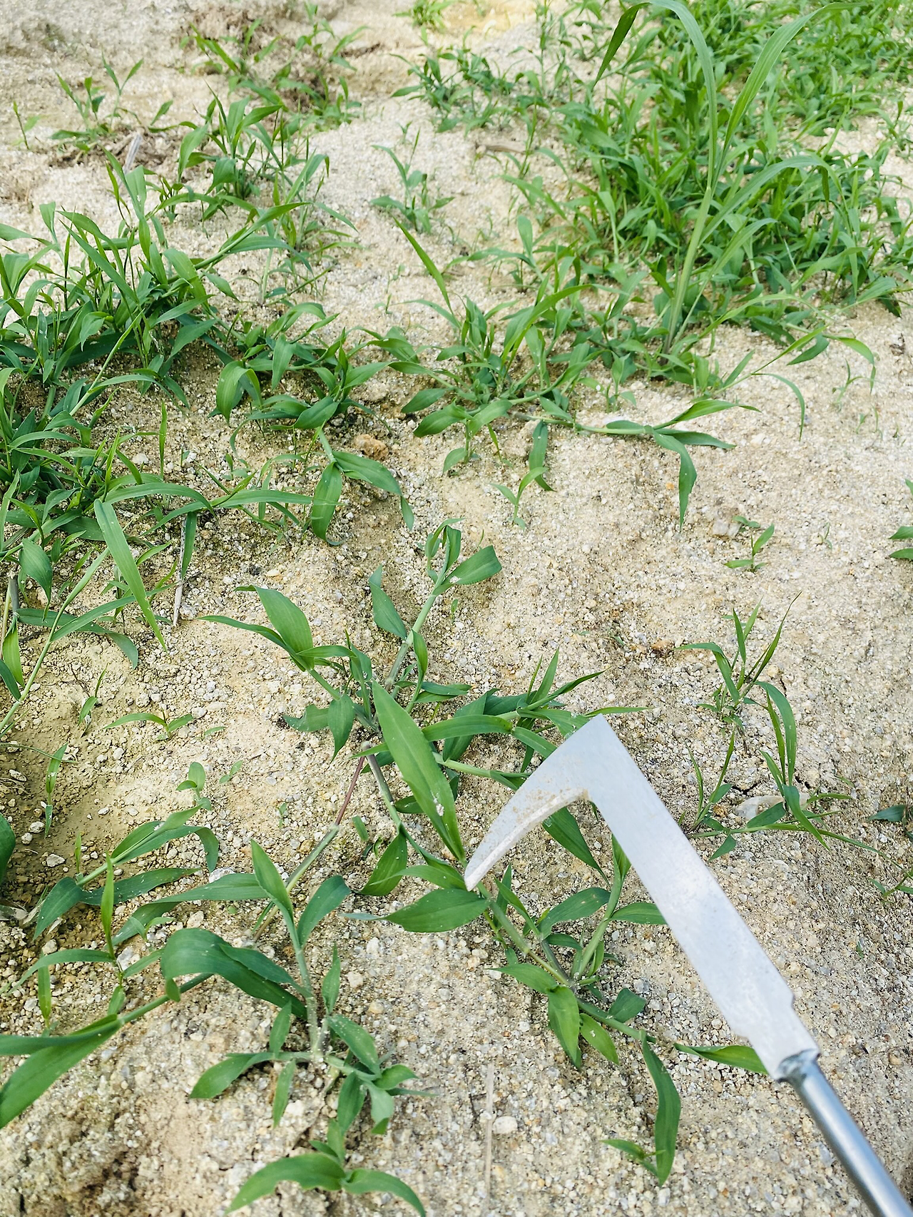 차양막을 안 해 생강의 여린 순이 많이도 말라죽었다. 다시 땅 속으로 들어가 새 순을 키우고 있는 생강을 피해 바랭이 풀을 제거하려면 세심한 주의가 필요하다. 어디에서 생강이 나올지 알 수 없는 와중에 날이 옆으로 넓은 호미를 들고 풀을 매기에는 위험부담이 크다. ’ 바랭이 풀 전용 낫‘을 살짝 빗겨들어 흙과 바랭이 풀뿌리만을 가르니, 가끔 생가을 감싸며 자라는 바랭이를 제외하고는 생강을 노출시키는 빈도가 현저히 줄었다. 하하하. 나는 김매기 여신이다! 시작은 좋았으나, 바랭이는 여신을 능가하는 풀의 신이다.