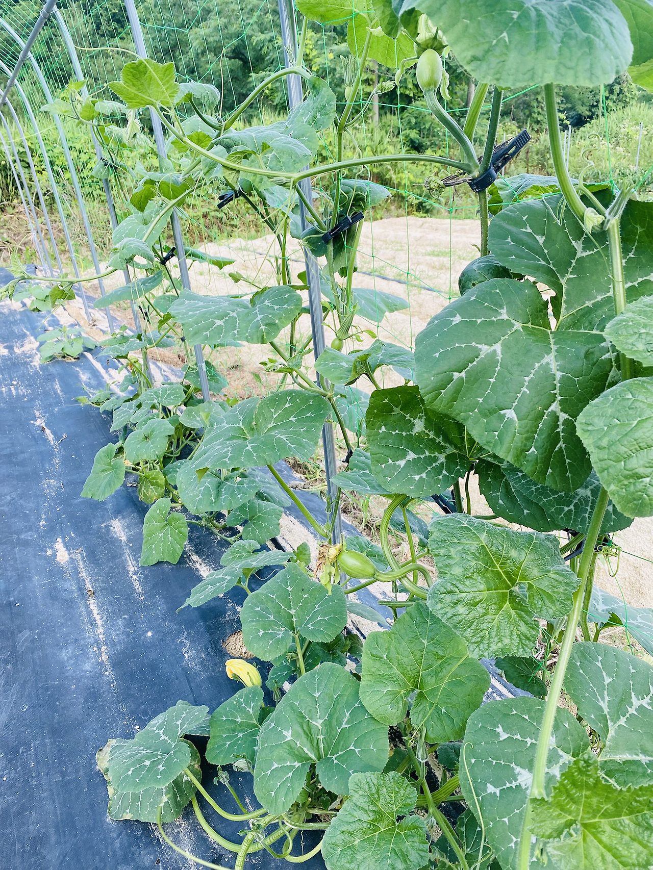 참외는 아직 바닥에 있다. 줄을 못 매 줘서 그렇다. 참외는 마구 자라는데 빨리 매 줘야 한다. 엄청 달리니 처치가 곤란할 수도 있다. 나는 한 마디, 두 마디 줄기를 따라 세는 것도 힘들고 아들순 손자순 가리는 것도 어렵다. 남편은 천재가 분명하다.
