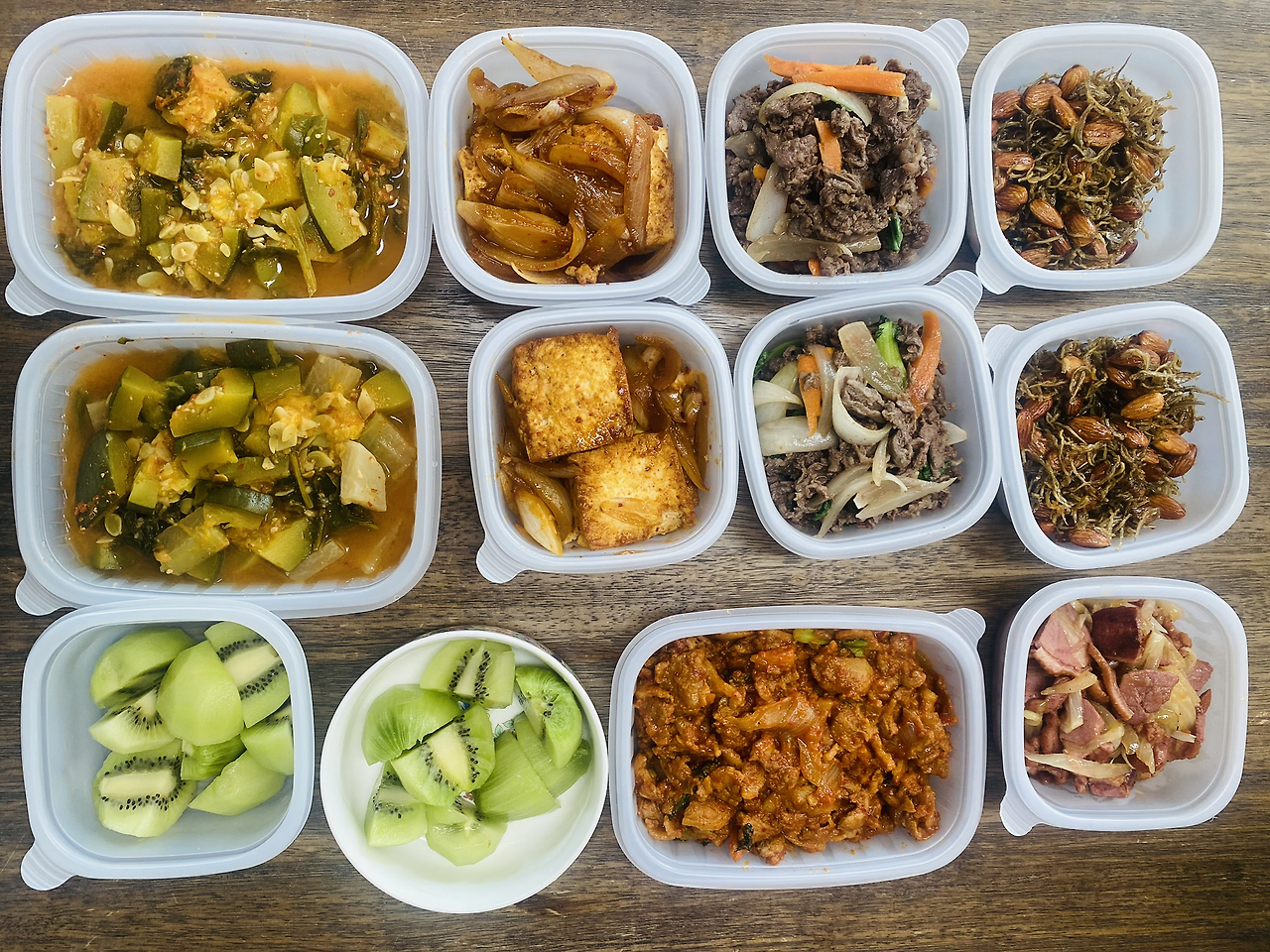 점심 저녁에는 조리를 안 하고 데워만 먹으면 됩니다. 저 정말 장합니다. 이 모든 것이 하루에 다 먹는 반찬입니다. 여섯 식구가 먹으면 하루 만에 빈 통이 됩니다. 저도 반찬 해놓고 일주일 먹으면 좋겠습니다.