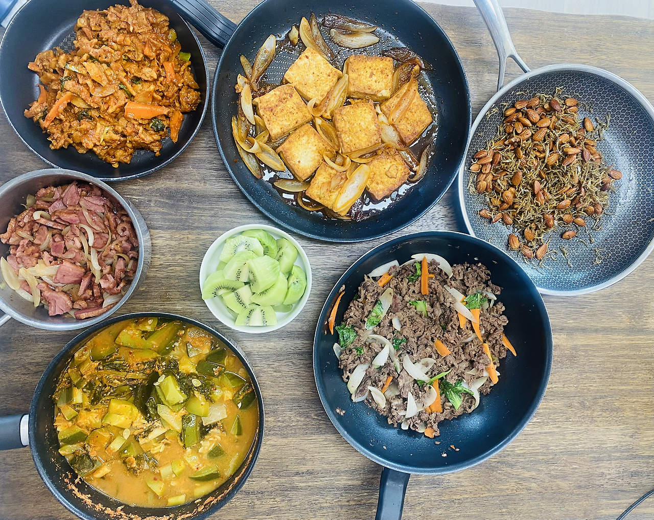 소 불고기, 돼지불고기는 저렴하게 많이 사서 양념에 재워 소분해 둔 것입니다. 야채 넣고 휘리릭 볶았습니다. 된장국 역시나 냉동에 소분해서 얼려둔 것입니다. 부글부글 끓이기만 하면 됩니다. 너무 쉽죠. 오리 훈제는 400그램 팩에 든 것입니다. 양파 하나 대충 썰어 넣고 간장, 고춧가루, 후춧가루, 설탕 조금 넣고 휘리릭 볶았습니다. 대충 썰었다 함은 도마를 안 쓰기 위해 지금까지 노력하였다는 얘기입니다. 그런데 두부는 도마에 썰어야 하네요. 두부는 두툼하게 여덟 조각으로 잘랐습니다. 두부를 팬에 굽다가 양파 하나 대충 썰어 넣고 오리훈제 볶음 할 때 많이 만들어둔 양념간장을 붓고 물을 붓고 지글지글 끓입니다. 멸치볶음을 시작하면서 작은 냄비 하나를 준비해 옆에서 설탕 시럽을 끓이며 시작합니다. 멸치랑 아몬드를 마른 팬에서 볶습니다. 기름 코팅을 하고 설탕시럽을 멸치에 붓고 센 불에서 빠르게 조립니다. 식히면서 팬에 그냥 두었더니 바삭한 게 식감이 좋습니다.