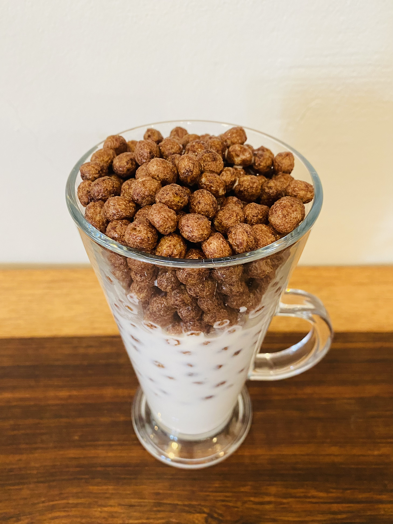 넓은 그릇에 코코볼을 넣고 우유를 부어주었지요.