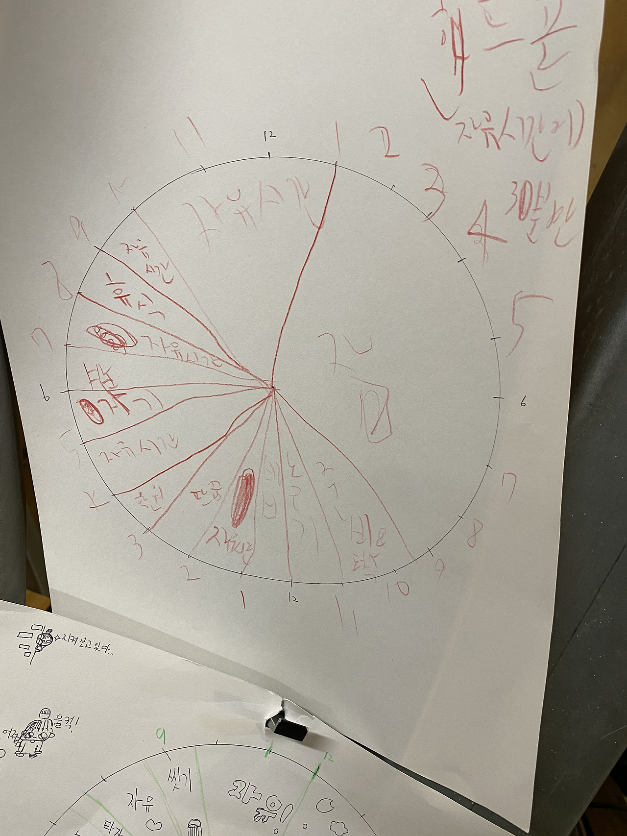 남매는 둘이 상의도 하고 어제와 오늘 것을 비교하면서 계획표를 작성하다. 시간이 없었던 어제는 전날 것을 그냥 사용해도 되냐고 물었다. 그래도 시간표를 가지고 와 앉았다. 달복이는 뭔가를 더 써넣었고 복실이는 그림을 그려 넣었다.