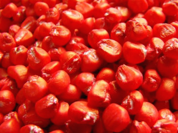 옥수수 낱알의 색깔은 당황스럽게도 붉었다. 병충해 방지를 위해 코팅을 해서 붉은색이었다.
