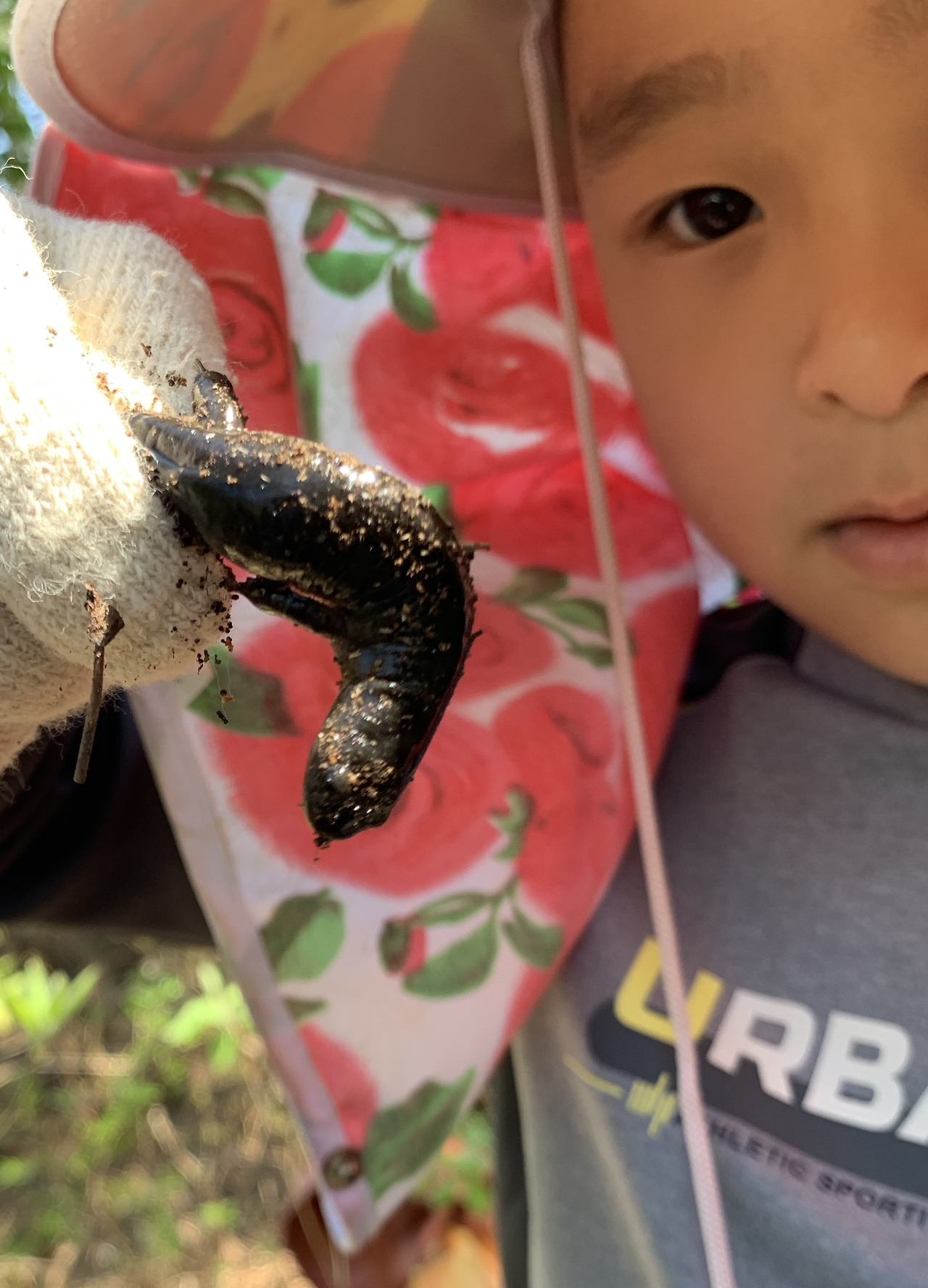 뽁뽁뽁뽁 잡초 뽑는 소리가 재밌다며, 조금 큰 아이들은 열심히 잡초를 뽑았고, 7살 막내는 잡초보다는 지렁이나 곤충에 더 관심이 많았다. 하지만, 넷 다 캠핑보다 훨씬 재밌다며 할 일이 있어 좋다고 한다.