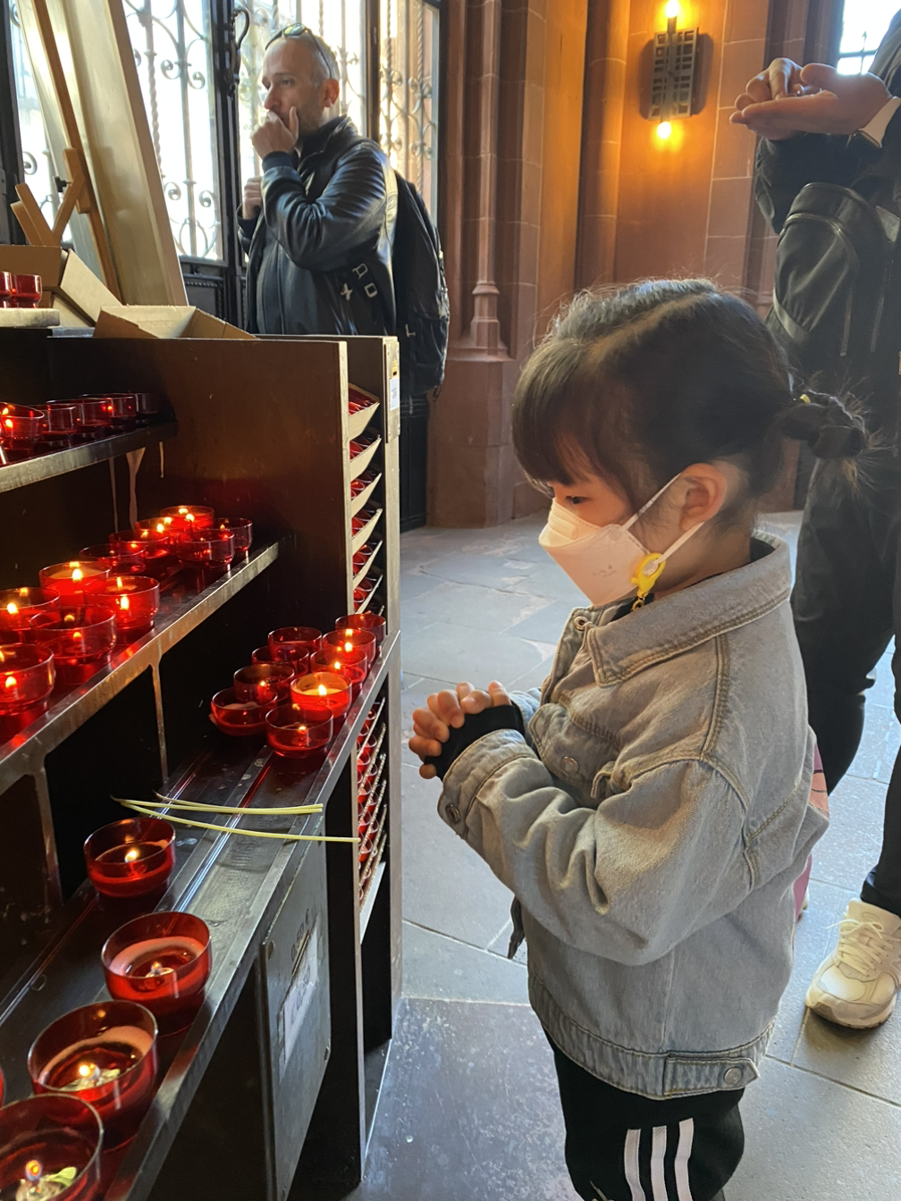 다음날 아침 일찍 체크아웃을 하고, 부자가 된다는 유로타워에 가서 사진도 찍고 트램도 타고 마지막으로 학센과 맥주를 마시며 여행을 복기한다. 돌아오는 길엔 프랑크푸르트성당에 다시 들어가 초에 불을 붙이며 소원도 빌어본다. 우리 딸도 야무지게 불을 붙이고 소원도 빌고.. 어떤 소원 빌었냐고 물었더니 "우리 가족 건강하고 행복하게 해달라고 했어"라고 말하는 기특한 내 딸.
