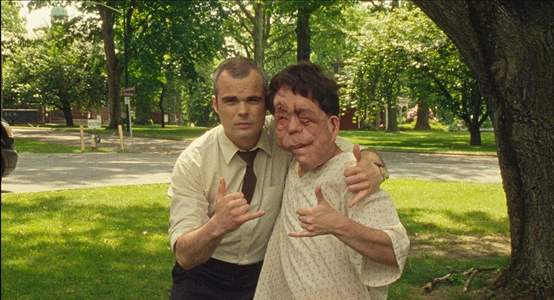<영원한 족쇄>는 이 포장법을 영화 속 영화의 남자 주연 맥스를 통해 먼저 보여준다. 메이블과 마찬가지로 잘생긴 배우인 맥스는 신경섬유종 환자 로즌솔에게 살갑게 다가간다. 먼저 말도 걸어주고 관심사를 물으며 같이 사진도 찍지만 그건 표면상의 표현일 뿐, 조금만 봐도 진심이 전혀 담기지 않았다는 것을 쉽게 감지할 수 있다. 메이블의 포장법은 어떨까. 메이블은 진심을 담으려고 노력한다. 로즌솔에게 최대한 친절하게 다가가고 도움도 주며 그(를 포함한 다른 모든 장애 배우)가 적절치 못 한 대우를 받는 것에 대해 부당함도 느낀다. 하지만 딱 거기 까지다. 메이블의 이러한 감정과 친절은 진정한 공감에서 나오는 것이 아니라 연민에서 기인한 것이다. 나보다 훨씬 못 한 처지에 있는 저들에 대한 연민. 낮은 곳에 있는 자들을 위로해주고 평등하게 대해준다는 우월감이 과연 맥스에게만 있다고 말할 수 있을까? 매스컴에서 조차 살인자의 외모를 묘사할 때 신체적 결함이 있다고 선전하는 사회의 구성원이 이러한 거부감으로부터 완전히 자유로울 수 있다고 믿는 건 자의식 과잉이자 자기에 대한 과대평가로 밖에 보이지 않는다. 뒤에 이어지는 씬에서도 메이블이 귀여운 외모의 호텔 직원에게 접근하는 방식과 로즌슬에게 접근하는 방식 사이에 굉장한 간극이 있다는 것을 보여준다. 결국 어떻게 포장을 하건 위에 선 사람은 아래의 사람을 절대로 이해할 수도, 공감할 수도, 위로할 수도 없으며 이게 가능하다고 말하는 것은 기만이라는 이야기다.