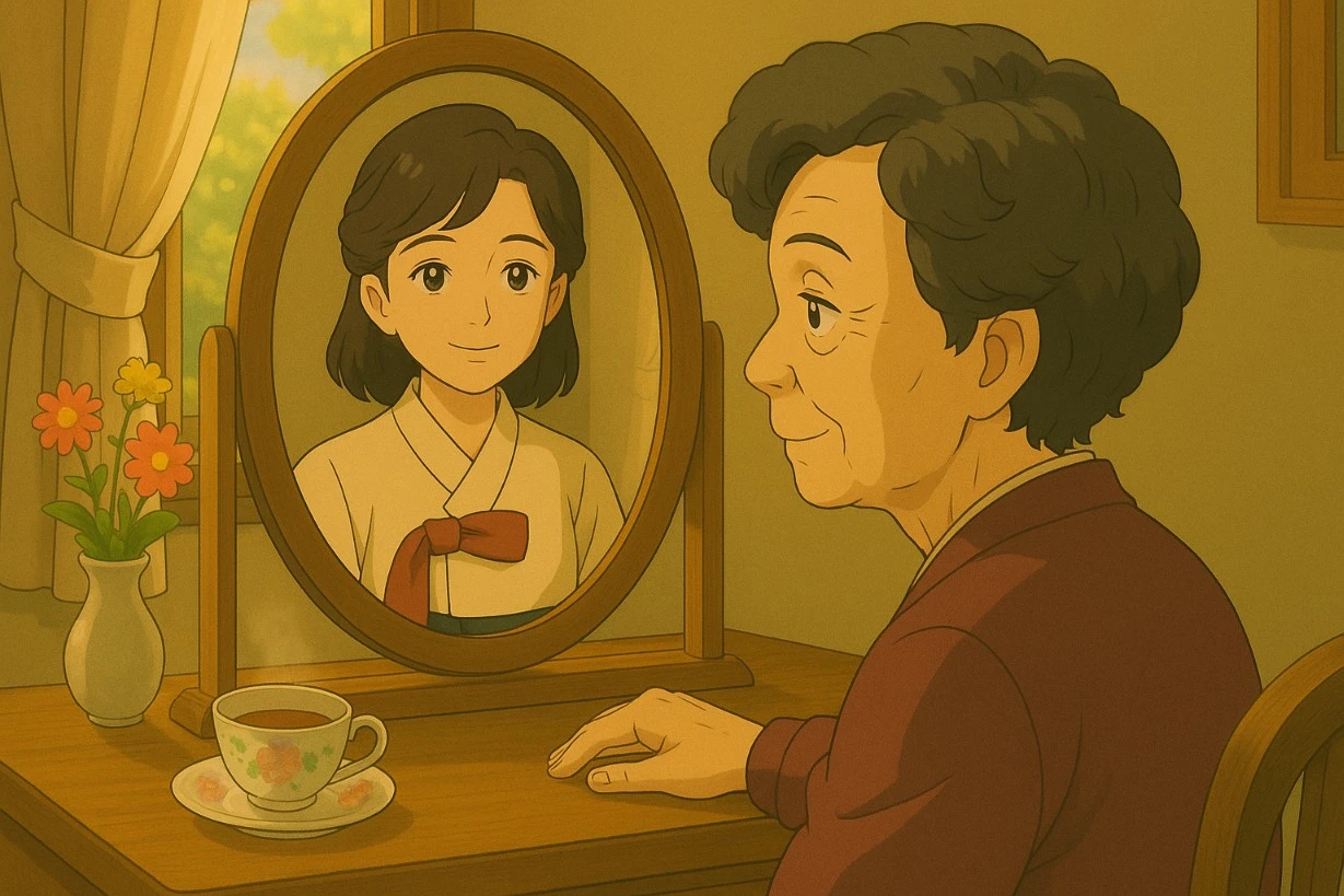 어머니는 거울 속 자신의 얼굴을 마주 보며