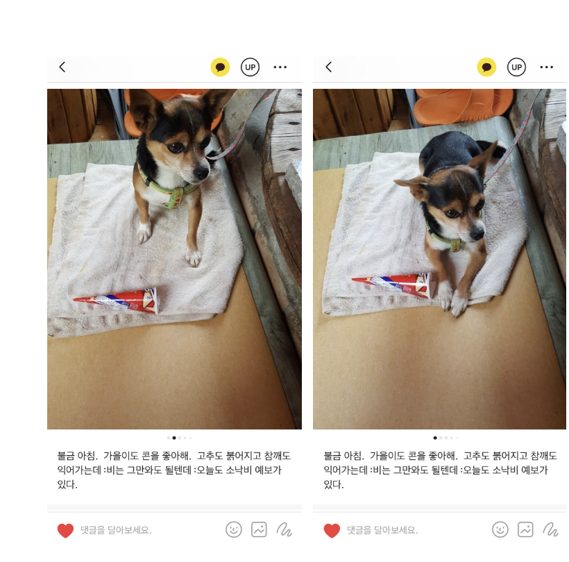 가을이와의 칠, 팔년의 시간 동안 알게 모르게 아빠엄마는 가을이 없이 한 것이 없을 정도로 가을이와 늘 함께였다. 산에 갈 때도 밭에 갈 때도 논에 갈 때도 아침에도 저녁에도 집을 나설 때도 돌아올 때도 늘 가을이가 아빠 엄마의 모든 순간이었다. 언제나 엄마는 “ 가을이 쟤는 진짜 행복할꺼다. 우리집에 와서. “ 라고 했다. 어떻게 태어나 어떤 시간을 보내다 우리집에 왔는지는 몰라도 가을이는 행복한거라고_ 얼마나 좋겠냐고_ 가을이의 견생의 남음을 엄마가 그리고 아빠가 함께 하기를 그토록 좋은 일이라고 말했었다. 그렇게 행복한 강아지였던 가을이를 엄마와 아빠는 잃었다. 그런 가을이의 빈자리를 어떤 것으로도 채우긴 어려웠다. 그렇게 몇 달을 비워진 그 자리를 메울 수도 없고 대신할 수도 없었지만 그런 시간이 버거웠는지 또는 어쩐 일인지 오빠가 어떻게든 치와와를 데려왔다. 그렇게 데려온 빵글이는 왜인지 가을이와 똑 닮아 있었다. 그 단풍 든 것 같은 털 색깔이 그냥 딱 가을이었다. 다른 것이라면 언제나 위풍당당한 가을이 와달리 겁이 엄청 많아 다가가지도 못하게 울어버린다는 점이었다. 아니, 사실 생각해보면 가을이와 털색만 같고 전혀 달랐던 거 같다.