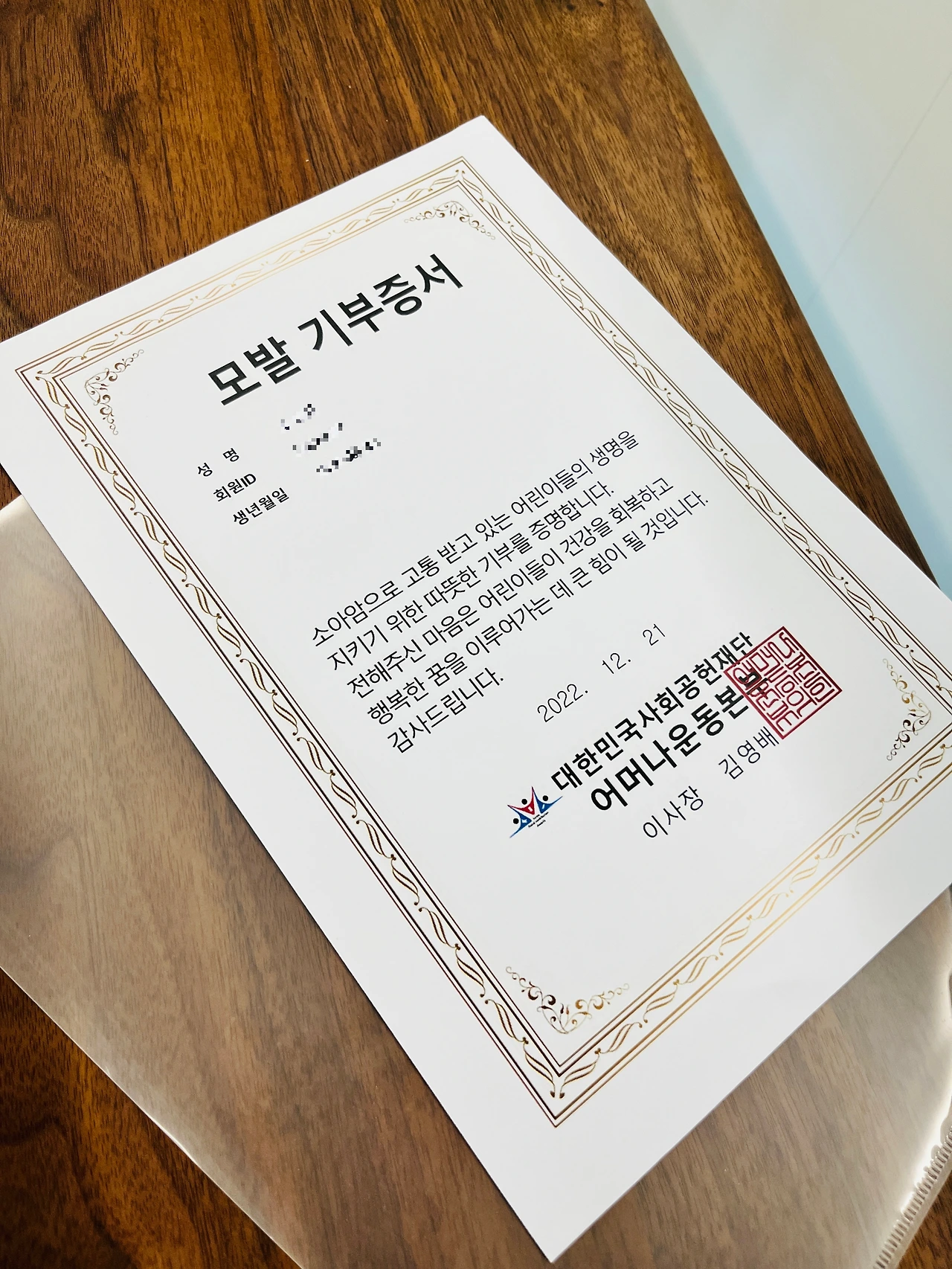나름 뿌듯한 이 감정을 저장해 두고 싶어 앵기맨에게 기부증서를 회사에서 몰래 코팅해 오라고 했더니 뭘 그런걸 코팅까지 하냐며 퇴근하면서 종이를 팔랑팔랑 그냥 들고 왔다.