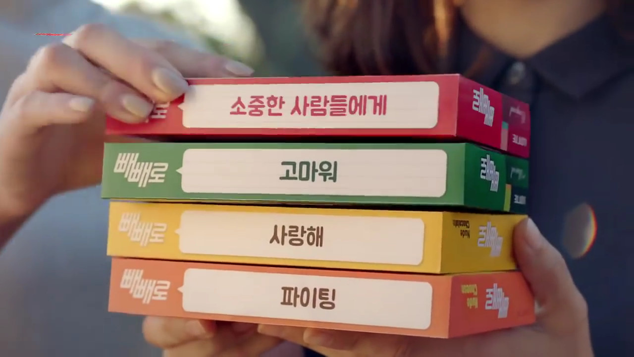 이런 든든한 빽이 함께라면 무엇이라도 두려울 것이 없을 텐데, '11월 11일은 그 날이니까 빼빼로를 사세요!'라는 단순 명료한 메시지에 만족하지 않았습니다. 2013년쯤부터 빼빼로 광고에 선물이라는 메시지를 정확히 담기 시작했고, 올해 광고에도 어김없이 빼빼로는 소중한 사람에게 마음을 전하는 수단임을 어필했습니다. 사실 가볍게 사 먹는 과자나 음료수에 너무 진지한 가치를 부여하는 것도 이상하고, 그렇다고 너무 B급으로 몰고 가는 것도 제품이 장수하는 데 있어서 그렇게 좋지만은 않을 것입니다. 하지만 빼빼로는 이미지 메이킹을 너무 잘했다 싶을 정도로, 지나치지 않은 적절한 수준의 가치를 부여했습니다. '가볍게 전하는 나의 마음'으로요.