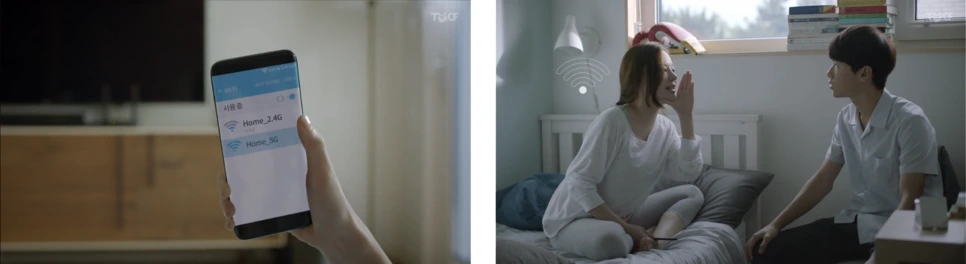기가만사성 광고 시리즈의 처음은 와이파이의 불편함에 대한 상황으로 시작합니다. 와이파이가 잘 터지는 동생 방에 침입한 누나, 늦게까지 온 가족이 와이파이를 사용해 느려진다고 투덜대는 엄마, 거실일 때와 방일 때 일일이 장소에 맞는 와이파이를 연결해야 하는 게 불편한 친구. 실제로 많이 겪을 법한 와이파이 상황을 광고 시리즈에 고스란히 담아내고 있습니다.