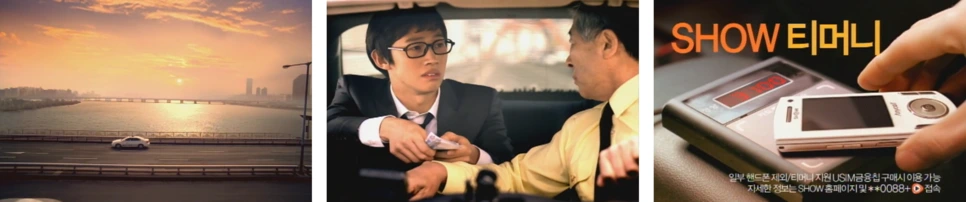 재밌으면서 핵심 메시지를 확실히 전달하는 광고는 계속 나오고 있습니다. 하지만, 옛날의 SHOW 만큼은 아니더군요. SHOW 대부분의 광고는 핵심 메시지를 전달하면서도 유머 감각을 잃지 않았습니다. 대표적으로 SHOW 티머니 광고가 있겠네요. 택시를 탄 한 남자가 통곡을 하며 한강 어느 다리 중간에서 내려달라 얘기합니다. 택시기사는 목숨은 소중한 거라며 남자를 말립니다. 알고 봤더니 돈이 3000원 밖에 없어서 그랬던 것이었습니다! 이에 휴대폰 티머니가 출시되어 그럴 걱정이 없다 이야기합니다. 이처럼 대부분의 SHOW 광고는 유쾌하고, 확실한 메시지를 전달하는 힘이 강했습니다.