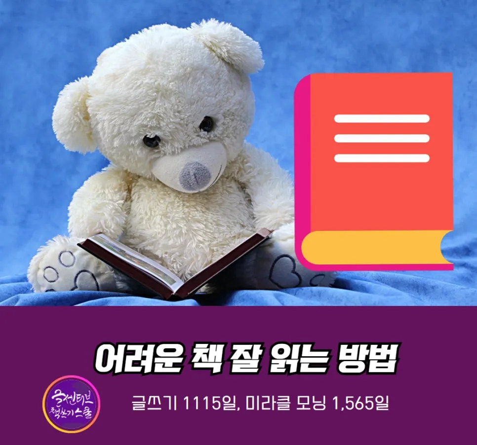 책 역시 마찬가지다. 어려운 책은 한꺼번에 읽으려면 힘들다. 눈에 잘 보이는 곳에 두고 수시로 3분 정도 훑어 읽는다. 오고 가다 목차를 쓱 한번 보고, 전체 내용을 그림 위주로 읽어보고, 제목 위주로 읽어 보고, 목차 중 관심 가는 꼭지를 읽다 보면 어느 순간 익숙하게 되고 책을 읽게 되는 경험을 하게 된다.
