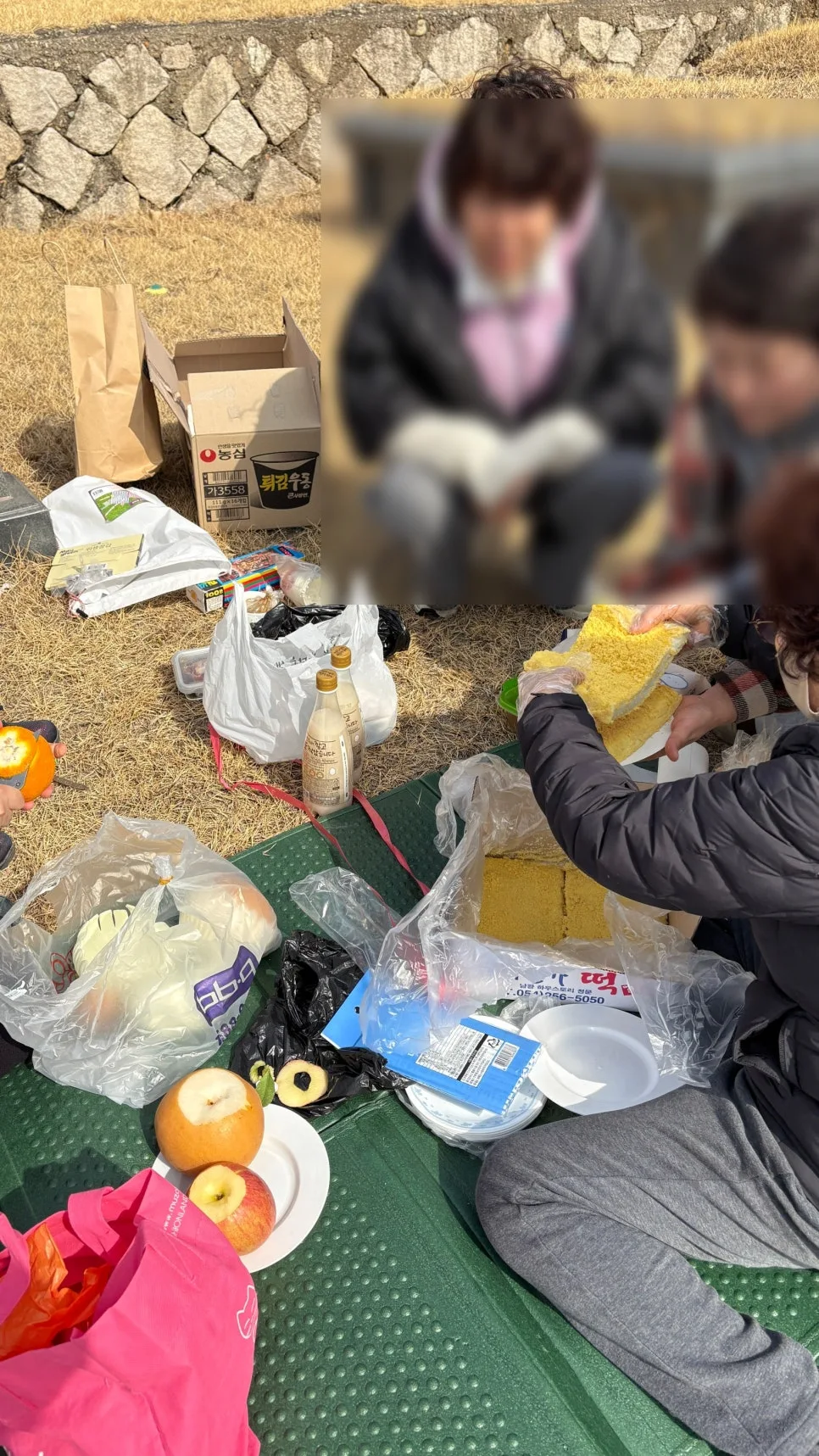 돗자리 위에 앉아 음식을 나눠먹었습니다.