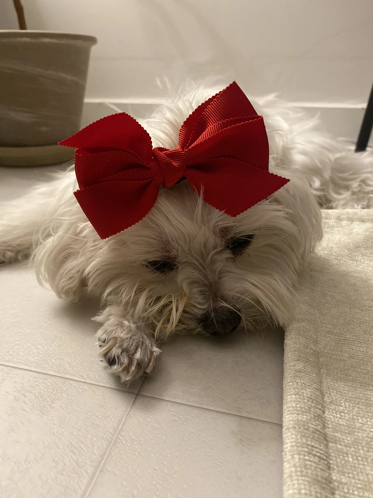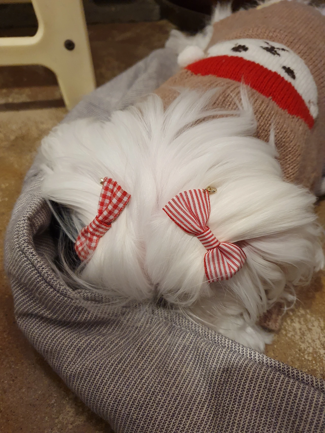 두 마리의 반려견 중에서 암컷인 뭉실이는 솔직히 뭉치보다 코도 조금 길고 인물이 엄청 예쁜 강아지는 아니었다. (내 강아지니까 내 눈엔 예쁘지만, 난 아주 객관적인 사람이니까.) 털이 짧아지면 짧아질수록 이 녀석이 수컷인지 암컷인지 구분이 가지 않았다. 그래서 나는 뭉실이에게 어렸을 때부터 굳이 암컷이라는 걸 표시하려고 머리가 조금 길면 핀을 꽂아주거나 묶어 주었는데 두어 살 될 때까지는 사진처럼 머리를 바닥에 헤집고 흩뜨려서 엉망진창이 되곤 했다.
