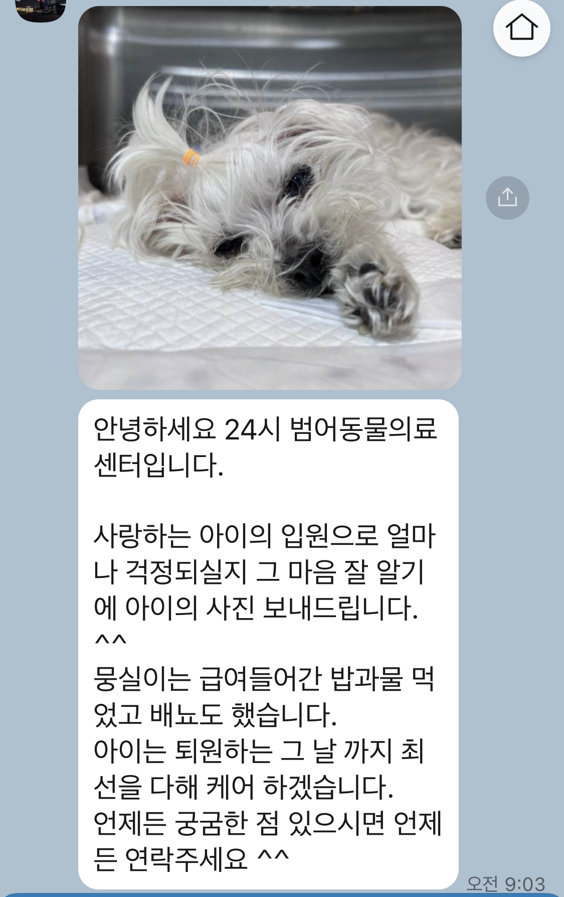 가슴이 철렁 내려앉았다. 하지만, 실이는 약속한 3일의 입원일을 무사히 견디는 듯했다. 중간에 면회 갔을 때는 더 기운이 없어 보였 긴 했지만..
