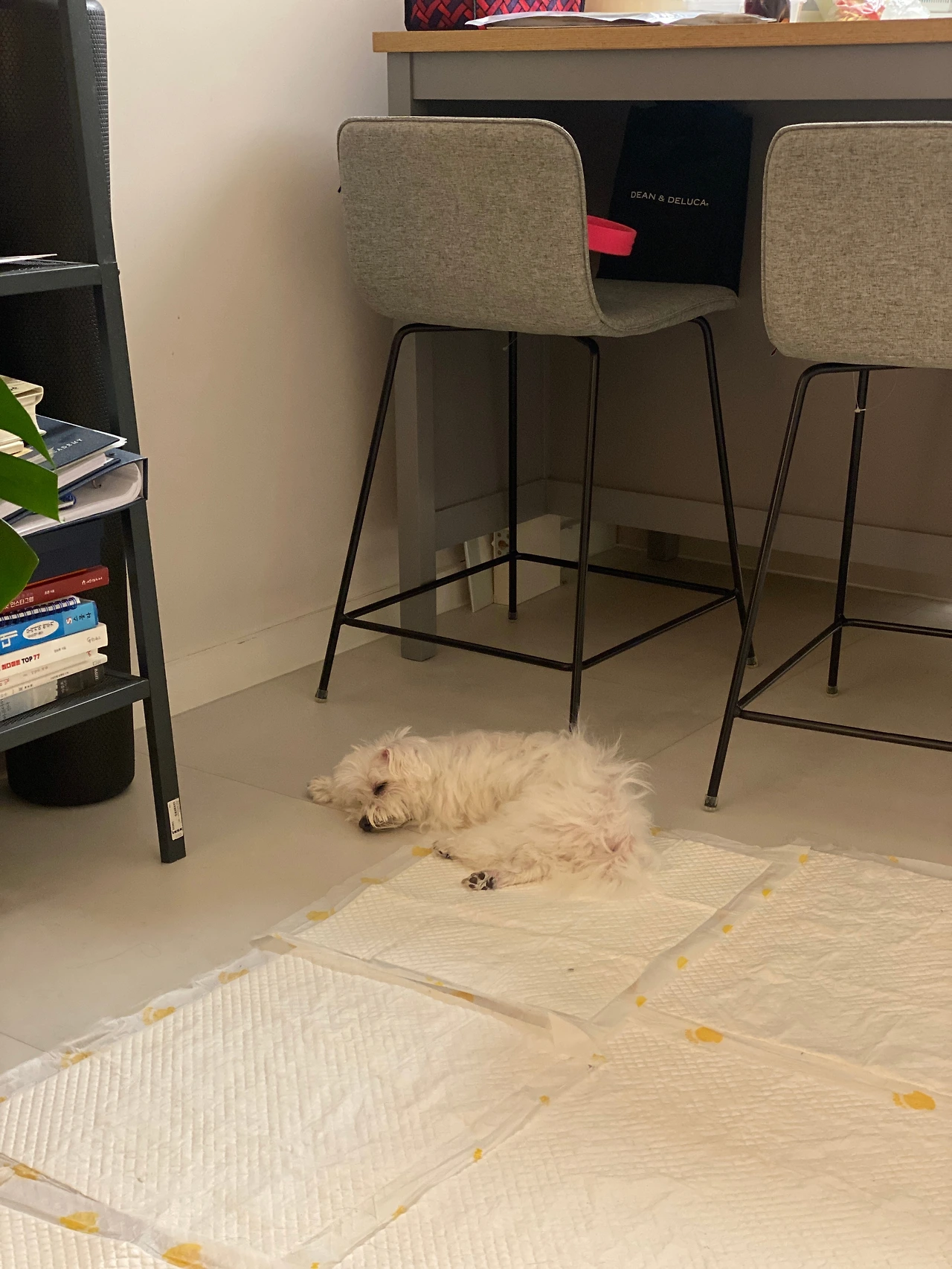 병원 가기 전 날은 생전 안 그러던 녀석이 새벽에 네 번이나 짖었다. 세 번째까지는 일어나 쓰다듬어주고, 안아줬는데 도저히 네 번 째는 일어날 수가 없어서 살짝 방문을 닫고 잠에 빠졌다. 아침에 일어나서 보니 그냥 지칠 대로 지쳐 쓰러진-죽었다고 해도 이상하지 않을-뭉실이가 거실에 엎드려 있었다. (실이가 떠나고 가장 내가 원망스러운 몇 가지 순간 중 하나이다. 얼마나 아팠으면 나를 불렀을까.. 내 잠이 뭐 그리 중요하다고..)