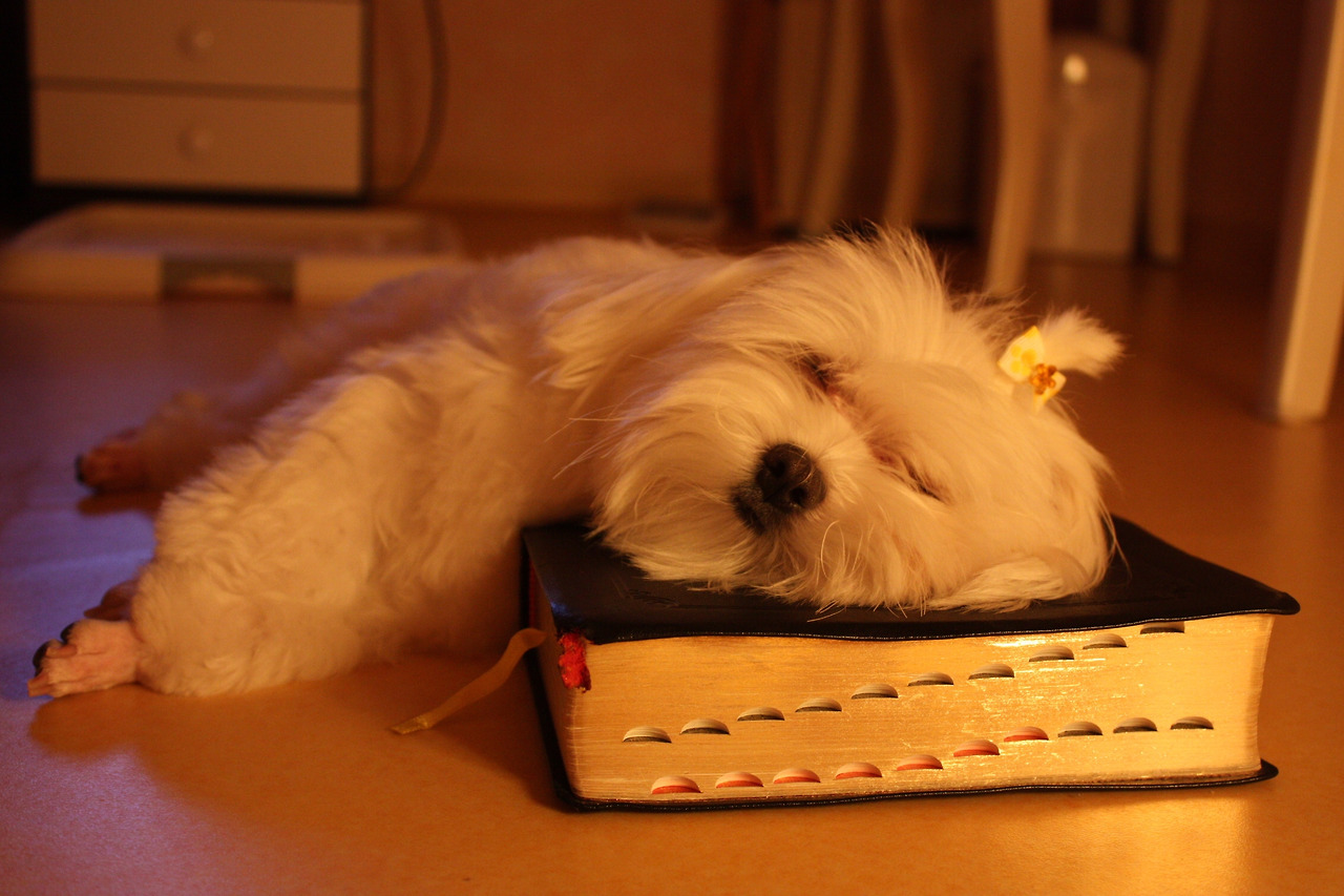 실이는 그날 엄청 피곤했는지 다다다다 달려오지도 않고 잠에 취한 얼굴로 몇 발짝 걷다가 꼬리를 살랑, 몇 발짝 걷다가 꼬리를 살짝 흔들며 겨우 엎드린 내 앞에 와서 드러누웠다. 그런데, 그 누운 위치가 정말이지 너무 기가 막히게 딱, 성서 위였던 것이지.