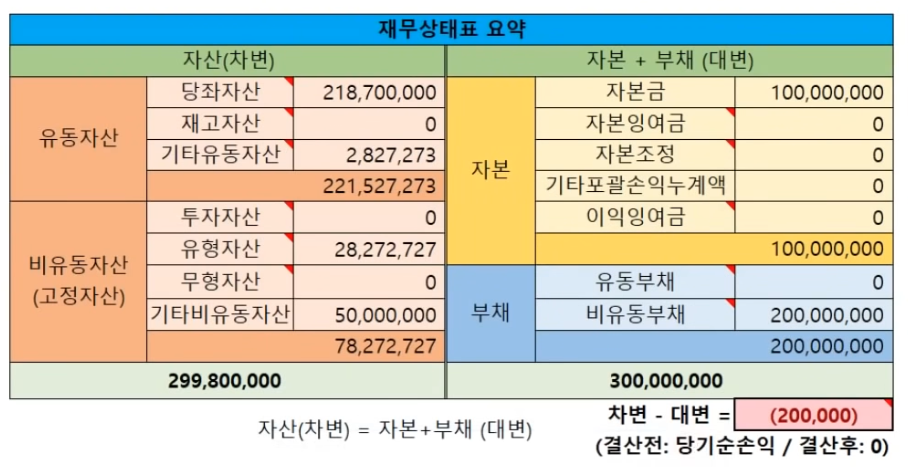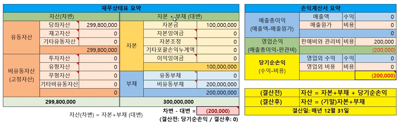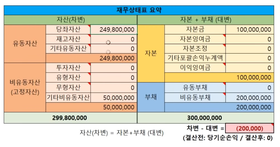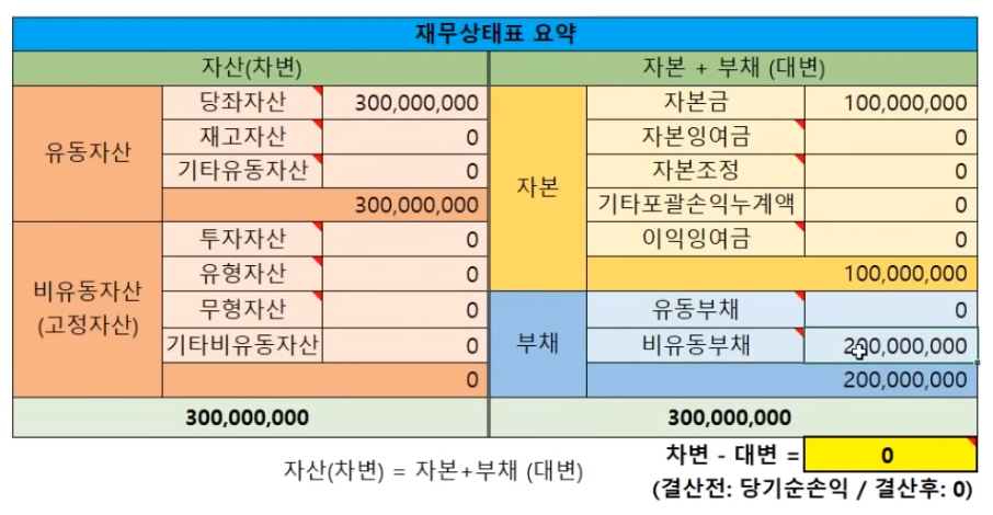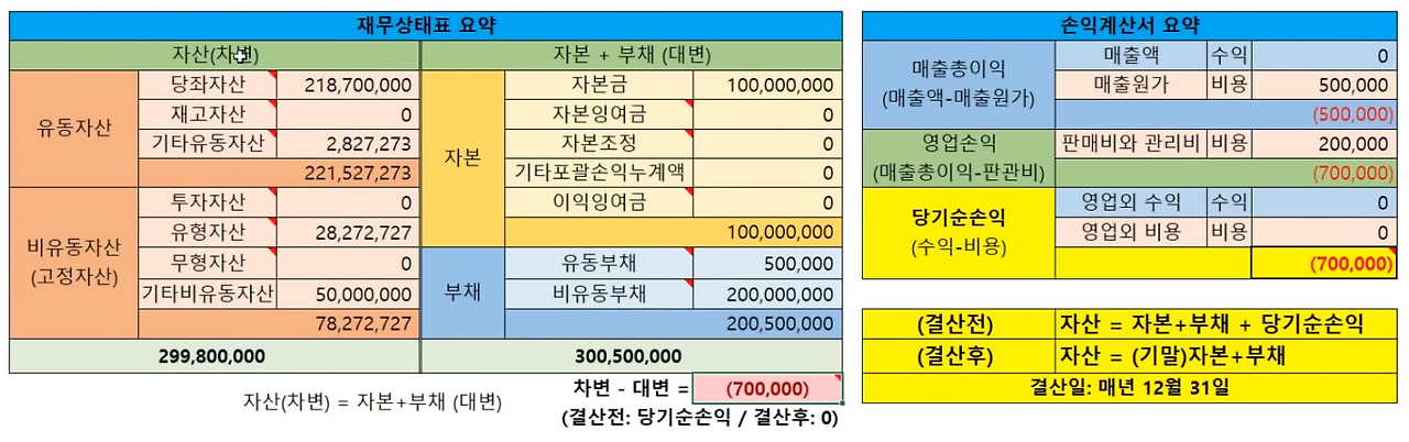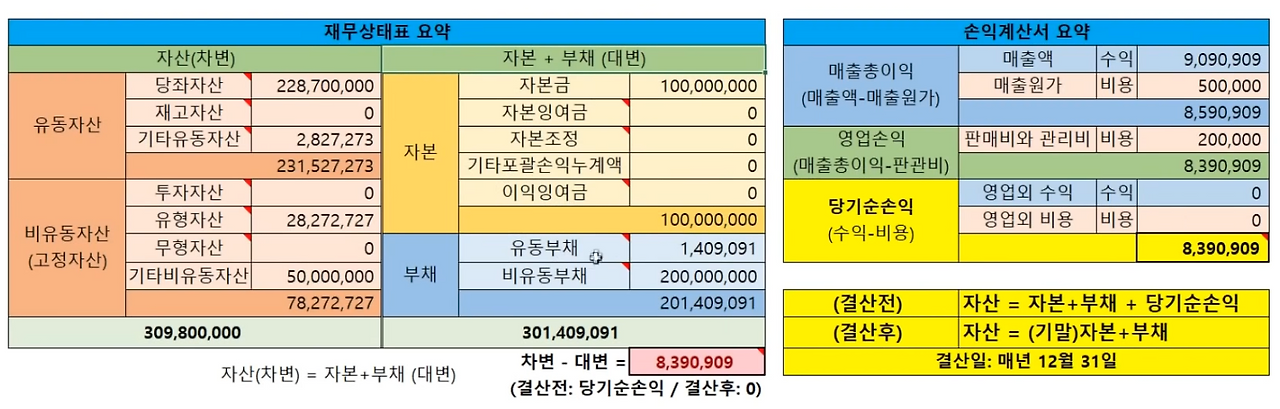 지금까지의 재무상태표 및 손익계산서 요약이 아래와 같이 나옴.
