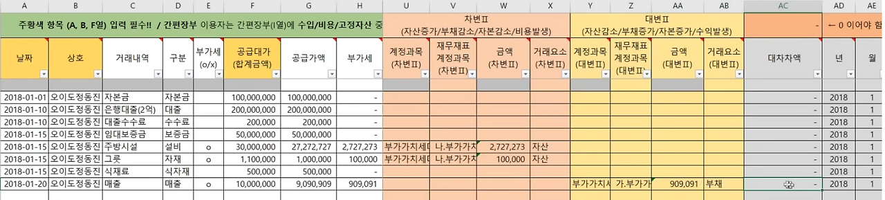F열 '공급대가(합계금액)' 입력하면 공급가액과 부가세까지 자동으로 나옴.