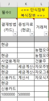 현금 매출과 카드 매출 구분해서 보고 싶을 때 비어 있는 J, K, L열을 활용해서 각각의 매출 금액 입력