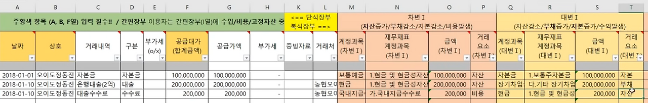 I열 '간편장부(수입/비용/고정자산)'는 부채의 경우 단식장부에서 해당 없어서 비워놓음.