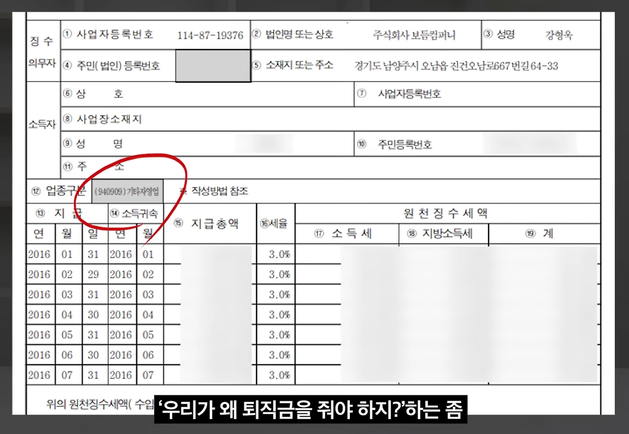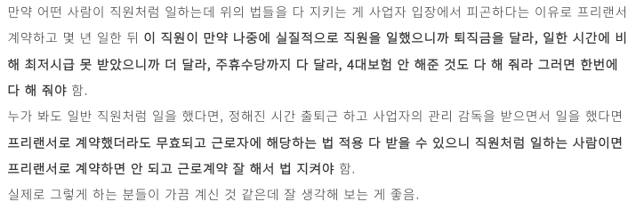 이에 대해 변호사 자문을 받은 결과 사업자 계약에서 근로 시간을 정한 것과 같은 부분 때문에 퇴직금을 주는 게 맞다는 결론이 났다고 해요.