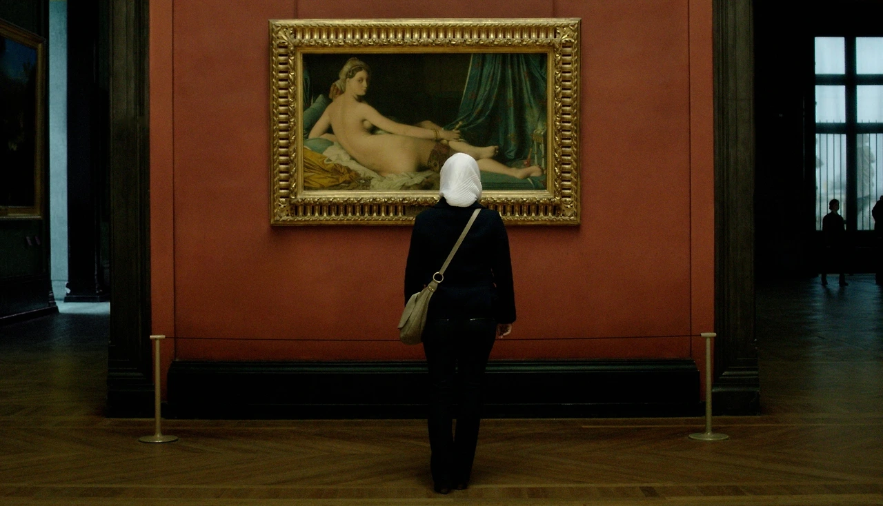 영화는 하프시아가 자신의 졸업시험 주제인 도미니크 앵그르의 "그랑드 오달리스크"를 응시하는 장면을 여러 방식으로 보여준다. 루브르 박물관에 전시된 작품 실물을 보는 장면은 물론, 작품 이미지가 실린 도록을 한 장 한 장 넘기며 가만히 살펴보는 모습에는 집중력이 담겨있다. 결국 발표장에 들어가기 직전 스카프를 벗기로 결심한 하프시아는 까만 머리카락을 내보인 채 결연한 표정으로 앵그르의 작품이 영사되는 커다란 스크린 앞에 선다. 세 명의 심사 교수들과 마주 보고 선 그녀는 화가의 의도를 중심으로 작품 해설을 시작한다. 당대 여성 누드화를 그린 수많은 화가들과 마찬가지로 앵그르 역시 오달리스크(오스만제국 술탄의 시중을 들던 시녀)를 가능한 에로틱하게 묘사하기 위해 피부색과 신체 비율을 왜곡했다는 등. 이렇게 교과서적으로 작품을 기술하던 그녀는 발표를 마치기 전, 갑자기 그림 속 주인공 오달리스크가 했음직한 생각을 웅변하듯 해설한다. 나체로 몸을 모두 드러낸 오달리스크가 감추고 있는 단 하나는 자신의 머리카락이라는 점을 짚어 낸 하프시아는 오달리스크에게 이 신체 부위가 갖는 각별한 의미를 설명한다.