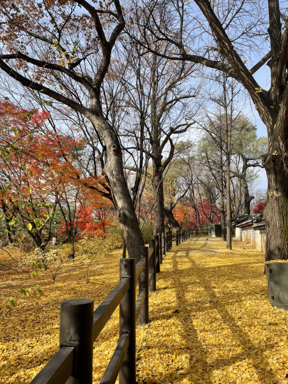 며칠 전 갑자기 기온이 영하로 떨어지던 날 가을 단풍을 보러 그녀와 덕수궁에 갔다. 평소 다녔던 정동길 덕수궁 돌담길이 아닌 영국 대사관 쪽의 덕수궁 돌담길로 향했다. 그녀가 이끄는 대로 먼저 세실 극장의 낮은 옥상에 올라 덕수궁, 시청 , 성공회 건물을 눈에 담은 후 영국 대사관 옆 덕수궁 안쪽의 샛문을 열고 들어가니 보행로에 노란 은행잎들로 낙엽길이 펼쳐져 있는 모습을 보니 입을 다물수가 없다.” 와 아름다워라! “
