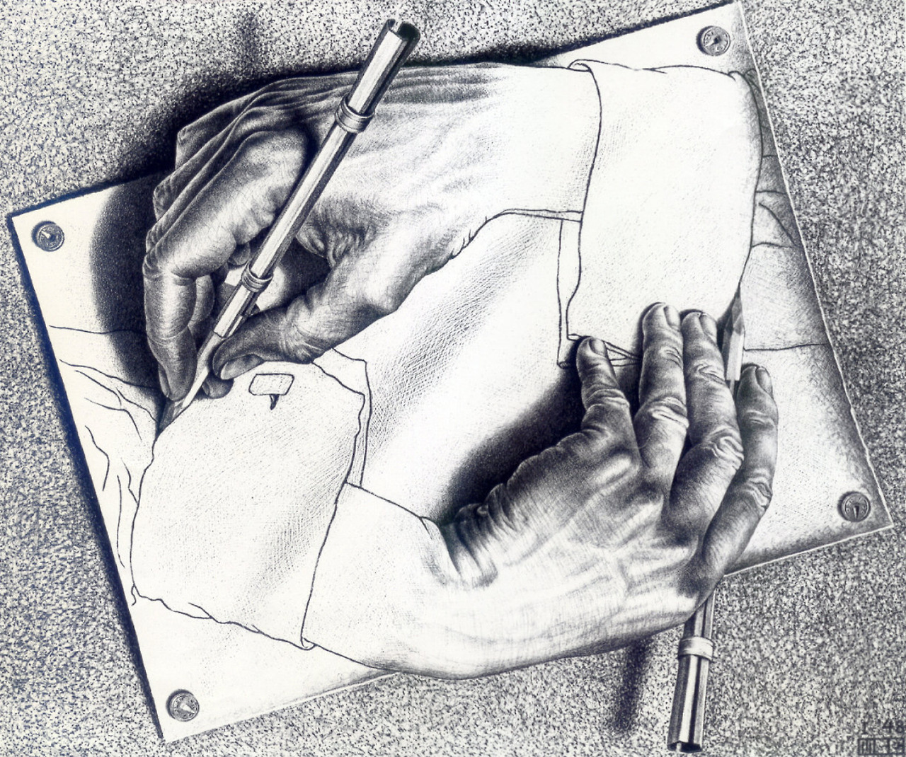 이 그림은 에셔(Escher)라는 작가의 '그리는 손(Drawing Hands)'라는 작품이다. 나는 언젠가 이 작품에 대한 해설을 들은 적이 있는데, 그게 오래토록 내 맘 속에 남아있다. 손이 손을 그리고 또한 손이 손을 그리면 이 작품의 시작은 어디일까. (다음 문장을 읽기 전에 5분 정도 나만의 답을 떠올려 보자) 그것은 바로 '내가 지정한 그 지점'이 시작인 것이다. 이 작품은 아이러니한 모습을 보여줌과 동시에 우리가 인생을 대하는 태도가 어떠해야 하는지도 함께 말 해주고 있다.