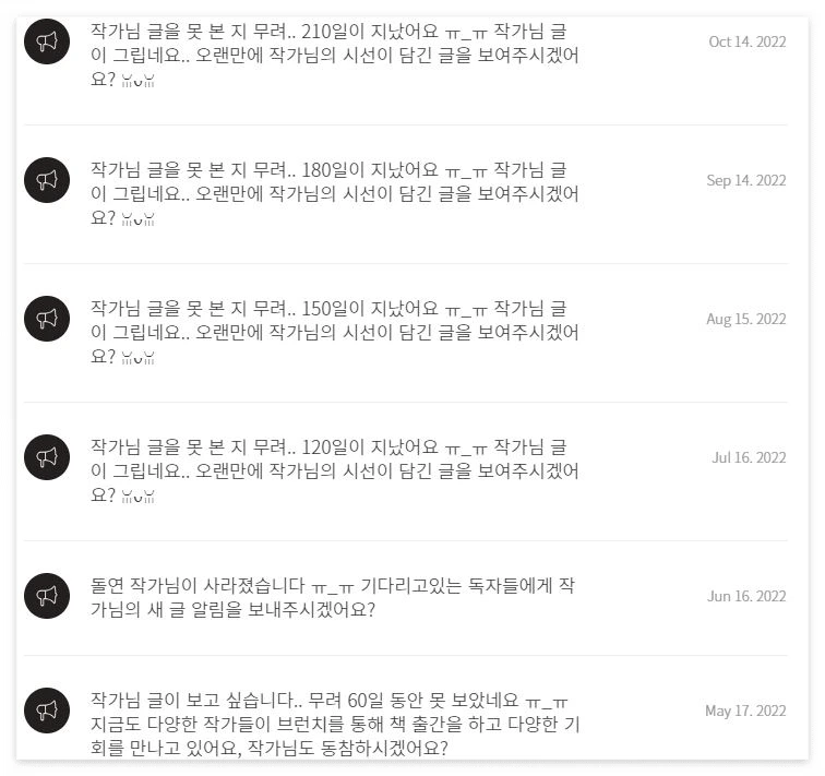 그런데... 역시 글 쓰는 건 어렵습니다. 브런치 승인을 받고 많은 글을 담아내지 못한 결과는 아래 사진과 같습니다. 너무 한 번에 승인을 받아 초심을 잃었던 건 아닌지... 카톡으로 아래 메시지를 받을 때마다 제 게으름을 탓하고, 무능함을 탓하며 스스로에게 찔렸습니다. 글을 써도 좋을 것 같다고 허락해준 ‘저의 브런치'에 초심으로 다시 시작해 보려 합니다. 이 글을 다짐으로, 완벽해야 발행할 수 있다는 부담감을 조금은 내려놓고 나에게 용기를 준 브런치의 문을 다시 두드려 봅니다.