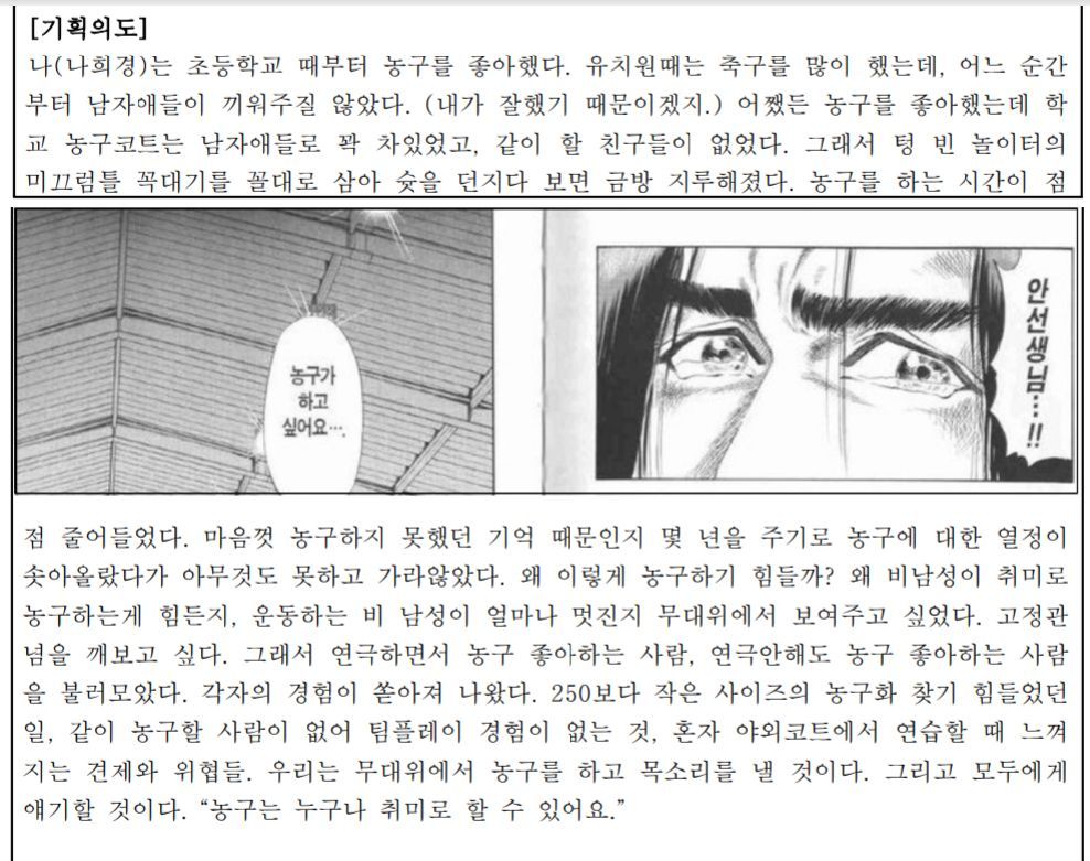 본 공연의 기획의도는 나희경의 어린시절 기억으로부터 출발한다. 이러한 개인적 기억으로부터 극 중 인물인 환희가 그려진다. 환희는 농구를 정말 좋아했다. 학창시절에는 프로 농구선수를 꿈 꿨다. 하지만 농구를 포기하고싶은 고비를 맞이한 뒤, 현재는 지리학을 전공하는 대학생이 되었다. 환희가 농구를 포기하게 된 계기가 자세히 나오지 않아 아쉬운 부분이 있다. 하지만 그녀의 생략된 전사 속에 기획의도가 채워진다. 또한 "요즘도 농구, 축구 다 남자들만 하는데 환희언니가 좀 특별해요."라고 재영이 말한다. 환희라는 인물을 통해 농구에는 자연스럽게 성별 이데올로기가 씌워져있음을 관객으로 하여금 느끼게 한다. '농구를 하는 여자'는 여전히 특별하다는 인식이다. 하지만 궁극적으로 본 공연이 던지고자 하는 메세지는 '보통의 농구'는 남성만의 것이 아니라 성별을 초월하여 누구나 즐길 수 있다는 점이다. 즐기는 자는 당연히 내가 즐거이 하는 것에 대해 아는 자다. 농구를 사랑하는 극 중 인물 '환희' 덕분에 관객들 또한 농구에 대한 지식을 자연스레 습득 할 수 있다.