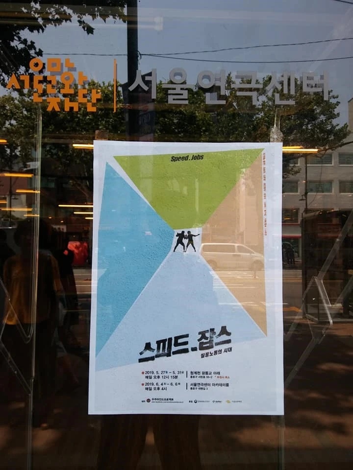 <스피드. 잡스>는 제목을 통해 스티브 잡스(Steve Job)를 상기시키며 ‘신자유주의1) 시대에서 이뤄낸 성공이란 무엇인가?’와 같은 질문을 던지려는 퍼포먼스라는 인상을 준다. 본 퍼포먼스의 최초 성격은 야외공연 형식으로서 ‘청계천 광통교’ 아래에서 진행되었다. 이 기간동안 주목할 점은, ‘우천시 취소’라는 알람을 관객들에게 사전 전달한 점이다. 퍼포먼스는 노동이다. 덧붙이자면, 퍼포먼스는 퍼포머, 연출, 스태프, 기획 등 모든 창작자 들이 시간, 체력, 정신력을 소모하는 대가로 자본이란 이익을 얻으려는 명백한 노동이다. 이러한 퍼포먼스라는 노동은 본디 자본을 얻기 위해 관객에게 질 좋은 퍼포먼스를 ‘서비스’ 해야 하는 노동윤리를 포함하고 있다. 하지만 본 퍼포먼스는 ‘우천시 취소’라는 사전 공지를 통해 이러한 윤리의식을 전복하려 한다. 관객이 투자한 자본2)보다 궂은 날씨 가운데에서 고생하지 않겠다는 창작자들의 의지가 담겨져 있다. ‘우천시 취소’는 창작자들(노동자들)의 자유에 초점을 맞춘 동시에 퍼포먼스 현장에서 노동시간 단축의 실험으로 이어진다. 이러한 자유는 자본주의의 명령으로부터 벗어날 자유뿐 아니라 또 다른 자유 —섹슈얼리티의 규범, 가구의 구성 및 가정 내 역할에 대한 전통적인 기준으로부터 벗어날 그런 자유들—로 확장 될 가능성을 내포한다.3)