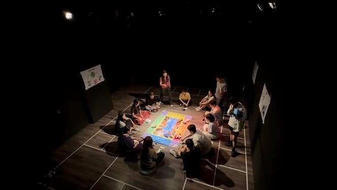 바닥에는 게임 판을 연상시키는 무대의 중간에는 동그란 방석들이 모여있으며,