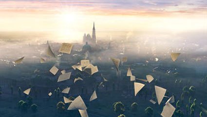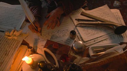 그 악보들은 소용돌이치다 흩어져 베토벤이 머물렀던 여러 장소에 떨어집니다.