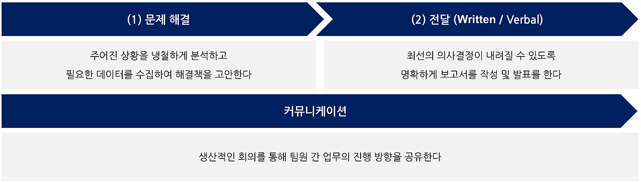 비유를 들자면, 문제 해결은 "물을 길어오는", 전달은 "길러온 물을 흘리지 않고 운반하는" 작업이다. 두 역할 모두 똑같이 중요하고 필요한 스킬이다. 뿐만 아니라, 업무를 진행하는 가운데 회의/이메일 등으로 꾸준히 소통하며 업무의 진전과 방향성을 조율해 나아가 원하는 결과를 함께 만들어 나아가는 팀워크와 커뮤니케이션 능력 또한 매우 중요하다.