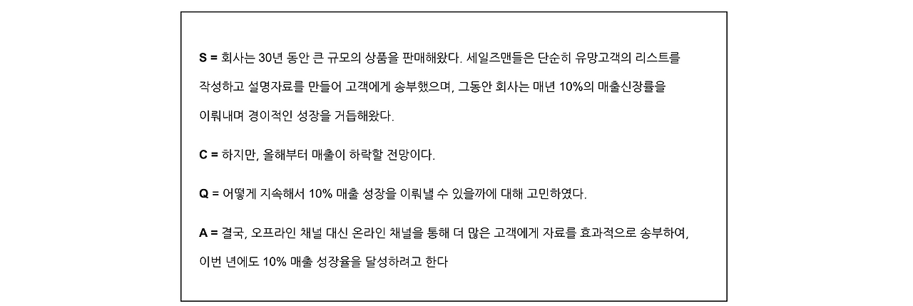 SCQA를 통해 스토리 형식으로 보고서의 배경을 효과적으로 설명할 뿐만 아니라 읽는 사람의 흥미를 불러일으킬 수 있다.