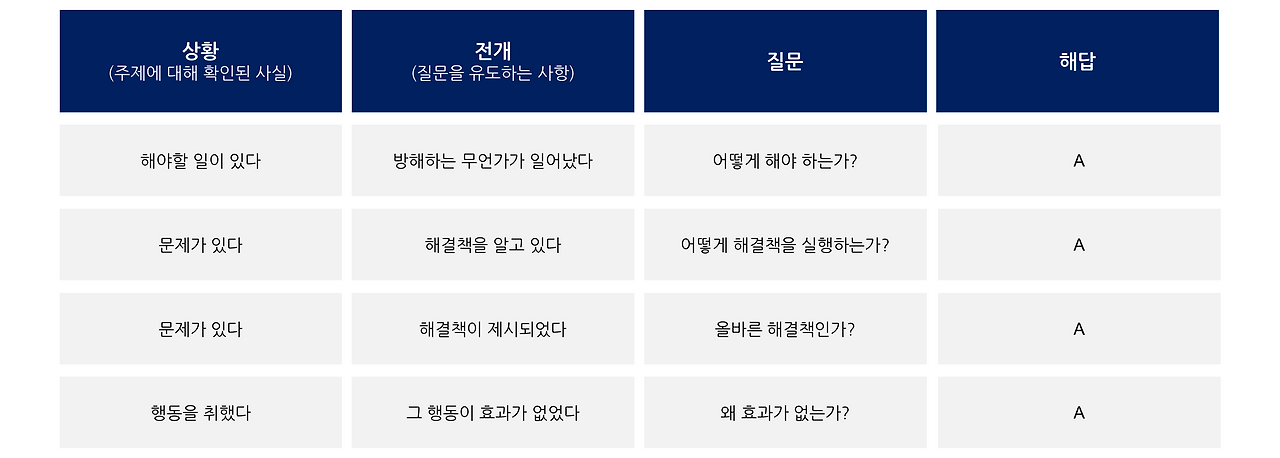 피라미드의 도입부는 스토리 형식으로 S(상황) > C(전개) > Q(질문) > A(해답)으로 작성한다.