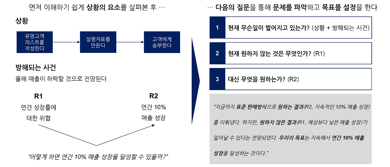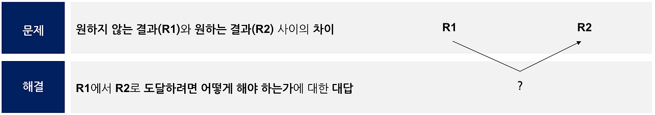 어떤 업무든, 문제 정의는 가장 먼저 해야 하는 일이다. 쉽게 풀이하자면, 문제란 "원하지 않는 결과(R1)"와 "원하는 결과(R2)"의 차이이며, 우리가 찾고자 하는 해결책은 이 차이를 극복할 수 있는 "대답"을 뜻한다. 그러므로, 현재 상황을 정확하게 파악하고 목표를 설정해야 해결책을 올바르게 찾을 수 있다.