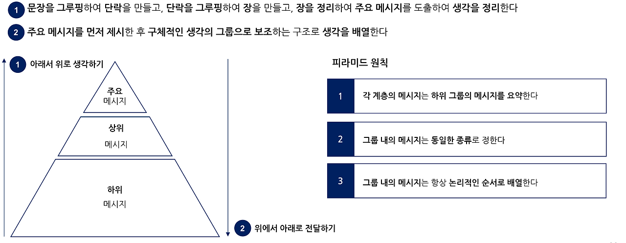 - 글은 피라미드 원칙에 따라 하나의 생각 즉 주요 메시지를 상위에 두고 부수적인 내용이 떠받는 글의 구성으로 쓴다