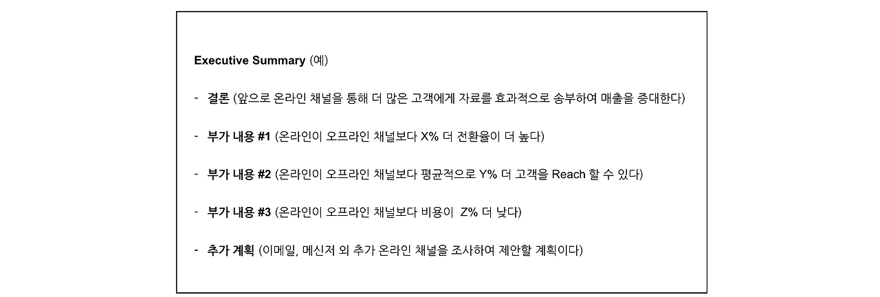 예를 들어, Executive Summary를 통해 전달하고자 하는 결론을 먼저 제시한 후 부가 내용을 간단하게 설명한다면, 전체 문서를 읽지 않고도 핵심을 빠르게 이해할 수 있다.