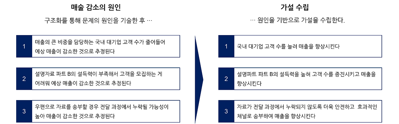 구조화를 통해 매출 감소의 원인을 추론해 본 후, 여러 가지 가설을 아래와 같이 수립할 수 있다.