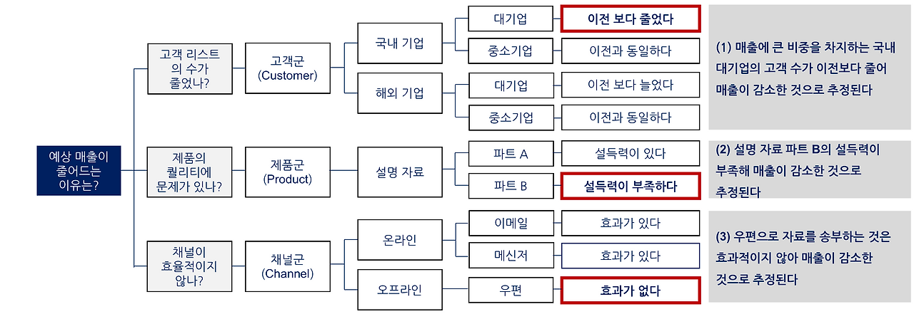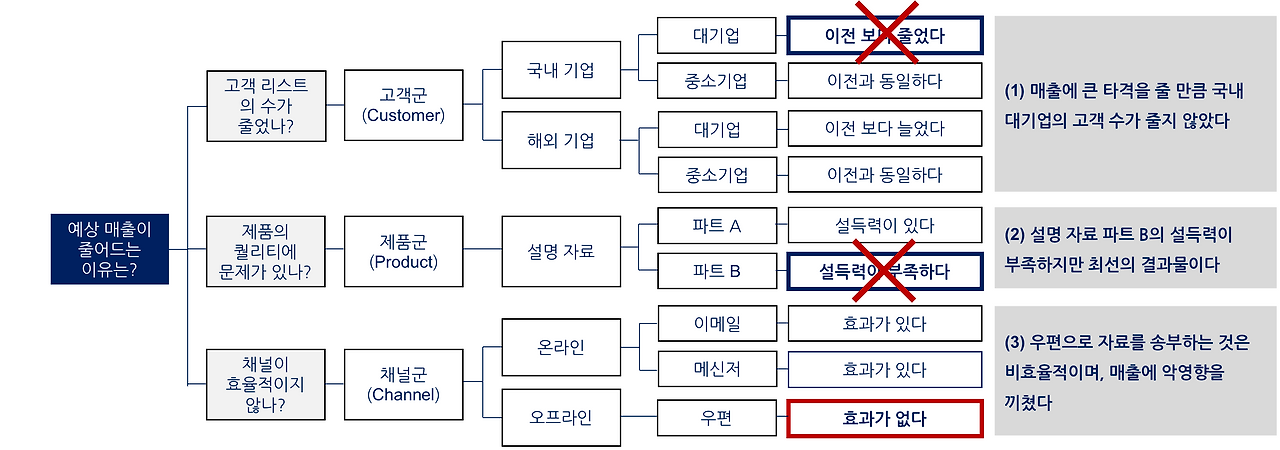 물론 다양한 방법으로 구조화가 가능하지만, 일단 segmentation을 통해 고객군/제품군/채널군으로 구조화를 할 수 있다. 보다시피, 각 세부 요수들은 MECE 기준으로 나눴으며, 문제의 원인일 가능성이 높은 요소들을 짚어내는 작업을 한다.