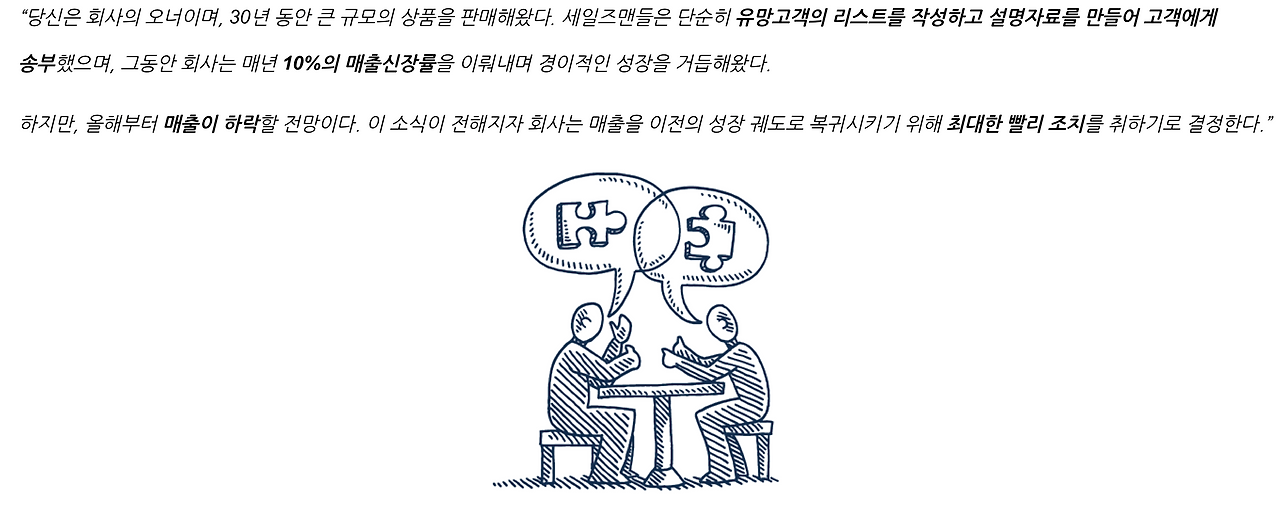 예시 문제로 돌아와 우리는 데이터를 통해 온라인 채널이 오프라인 채널보다 더욱 효율적이며, 비용을 줄이고 매출을 증대시킬 수 있다는 시사점을 도출할 수 있었다. 즉, 현재 상황에서 직면한 문제를 해결하기 위해 "앞으로 온라인 채널을 강화하여 더 많은 고객에게 자료를 효과적으로 송부해 연간 10% 매출을 달성한다"라는 해결책을 제시할 수 있다.