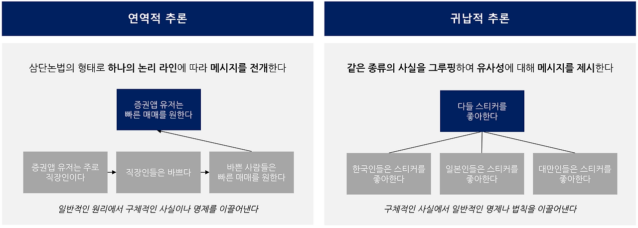 연역법이란 일반적인 원리에서 명제를 이끌어내는 방법이며, 하나의 논리에 따라 메시지를 전개하는 방식이다. 가설을 기반으로 효율적이고 빠르게 리서치를 할 수 있다는 장점이 있지만, 논리의 연결고리가 하나라도 끊어지면 전체가 무너질 수 있다. 즉, 섣부른 추측은 금물이다.