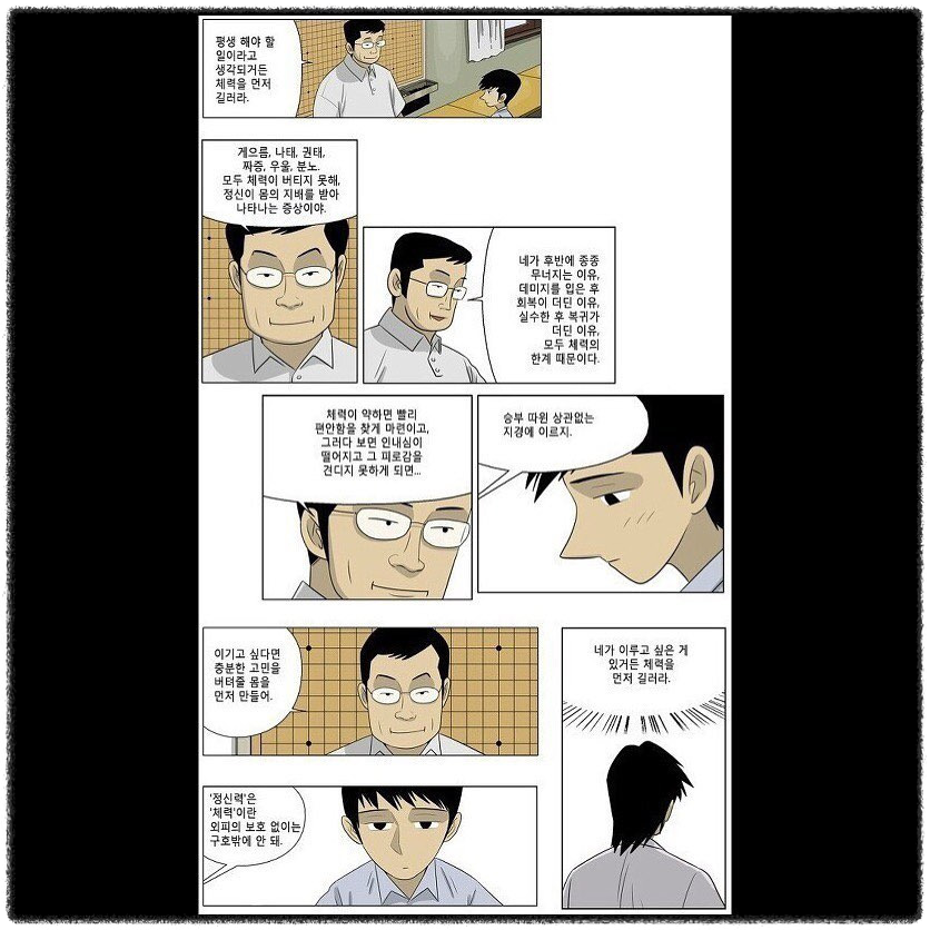 이기고 싶다면 충분한 고민을 버텨줄 몸을 먼저 만들어. '정신력'은 '체력'이란 외피의 보호 없이는 구호밖에 안 돼." — 윤태호, 《미생》